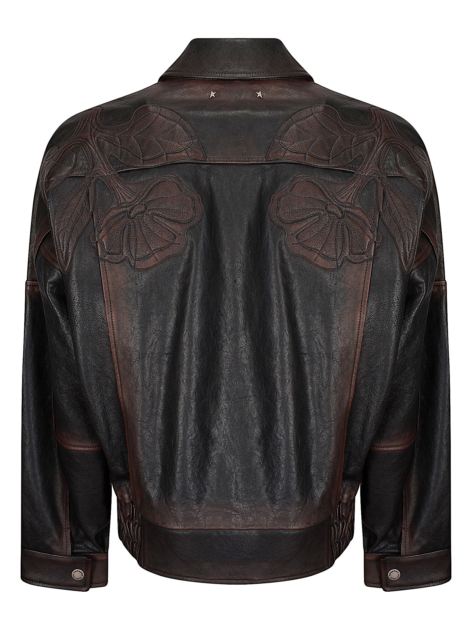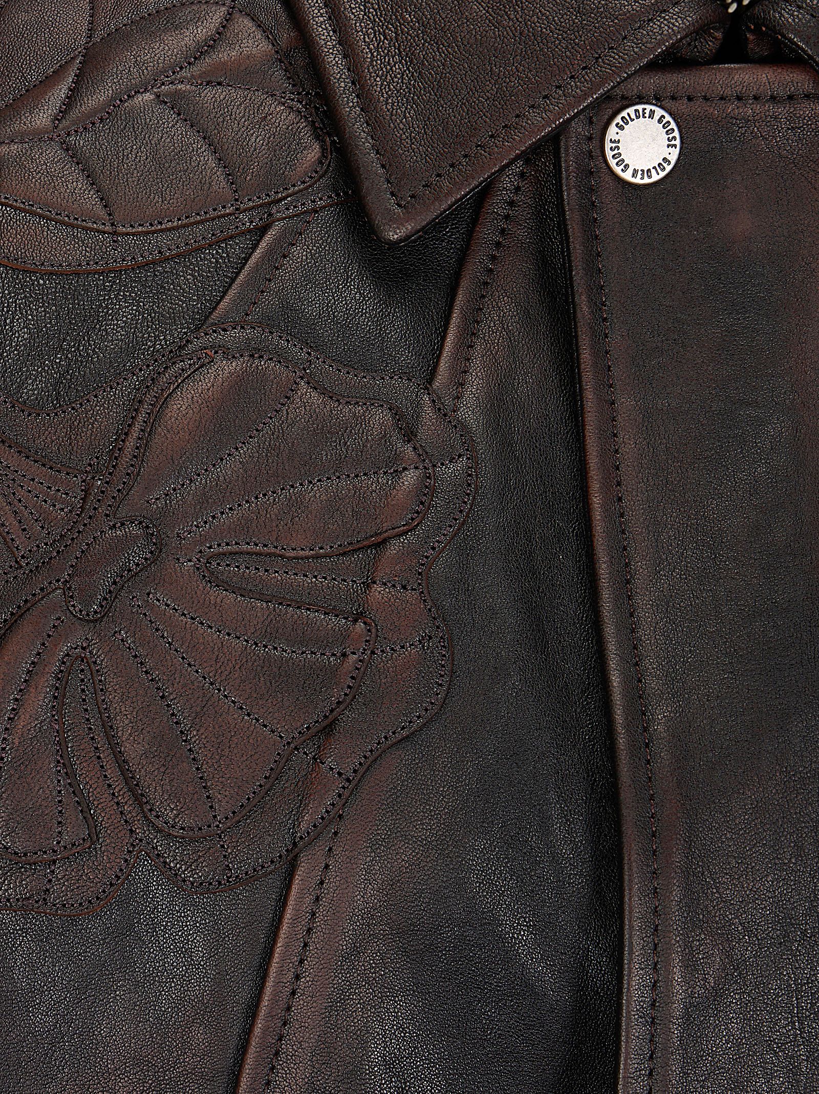 Giacca bomber fit oversize in nappa con ricami floreali tagliati a laser sul davanti e sul retro, tasche a filetto sul davanti, doppia stellina sul retro.