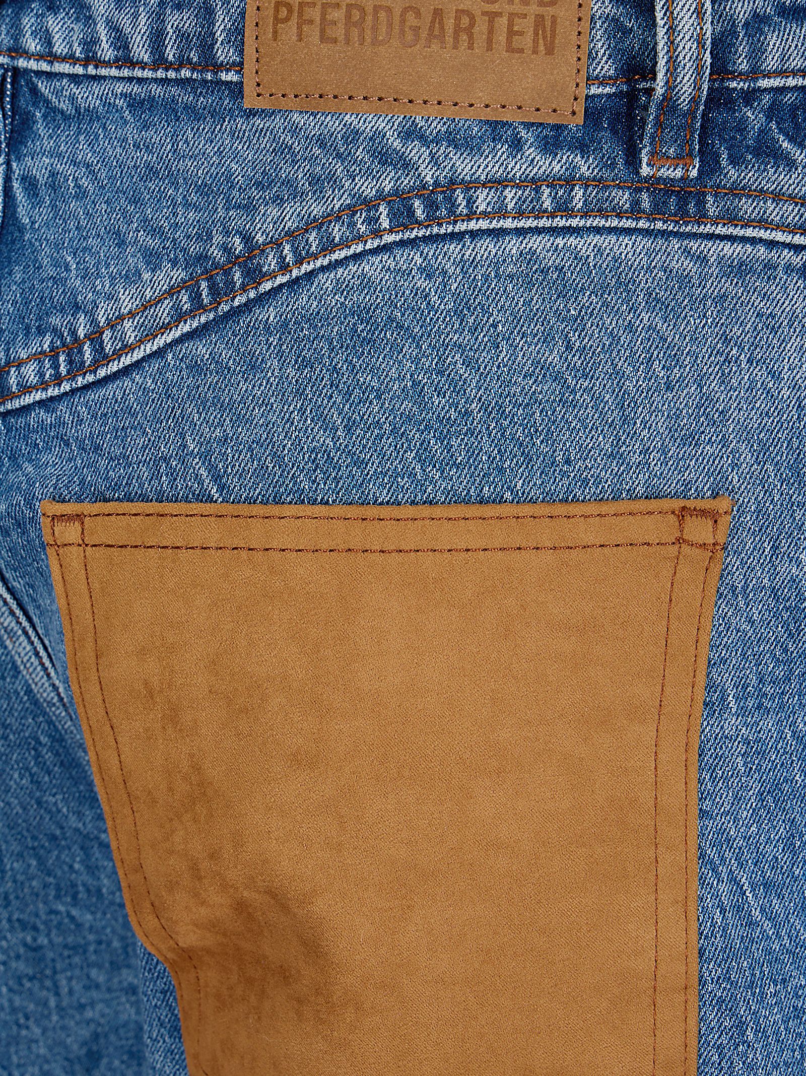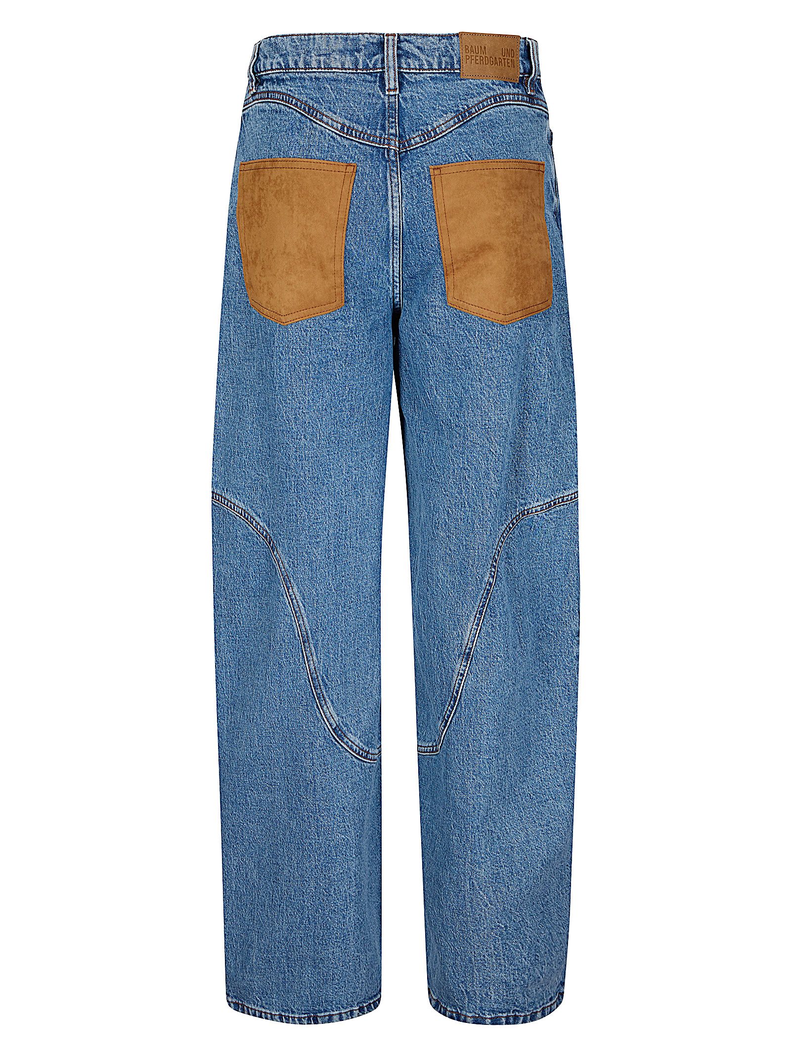 Jeans cinque tasche, vestibilità comoda e gambe curve, chiusura frontale con zip e bottone, tasche posteriori a contrasto, design a pannelli.