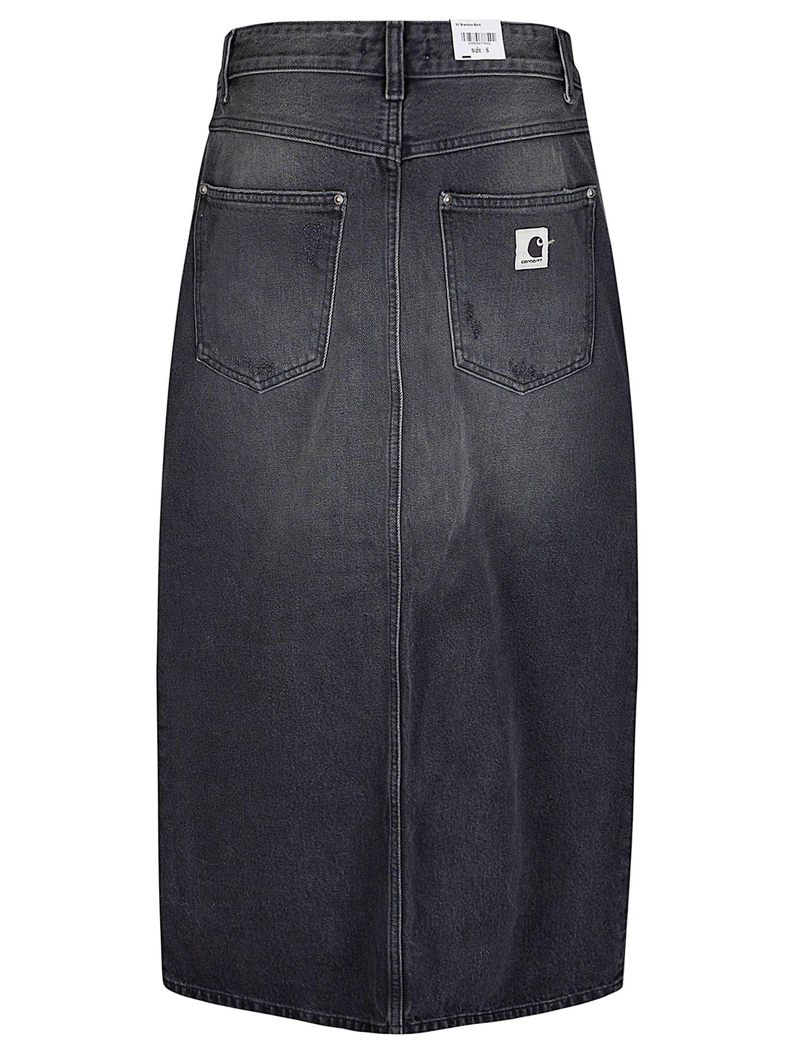 Gonna jeans cinque tasche, chiusura frontale con bottone e zip, etichetta logo tasca posteriore, spacco frontale, effetto used.