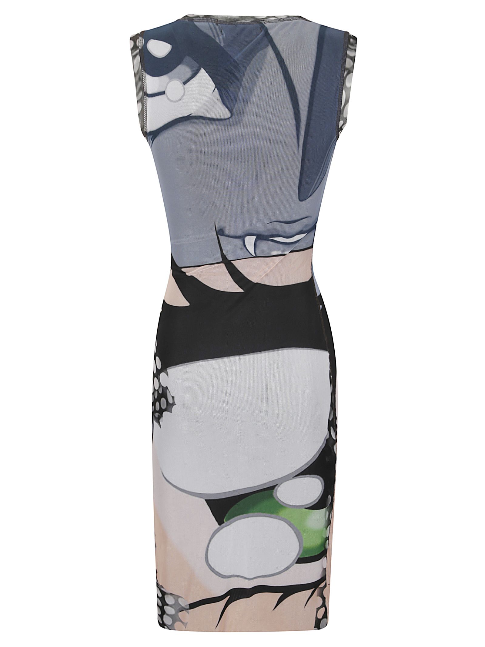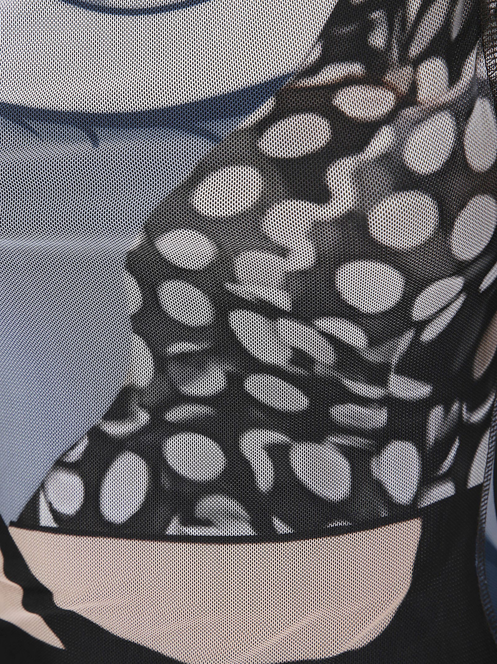 Ärmelloses Kleid, U-Boot-Ausschnitt, grafischer Druck auf halbtransparentem Stretch-Netz, Rohschnitt.