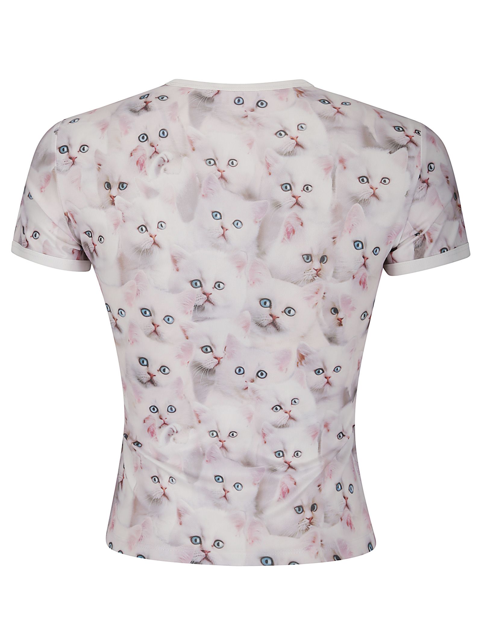 T-Shirt mit Rundhalsausschnitt, kurze Ärmel, schmale Passform, Aufdruck auf dem Stoff.