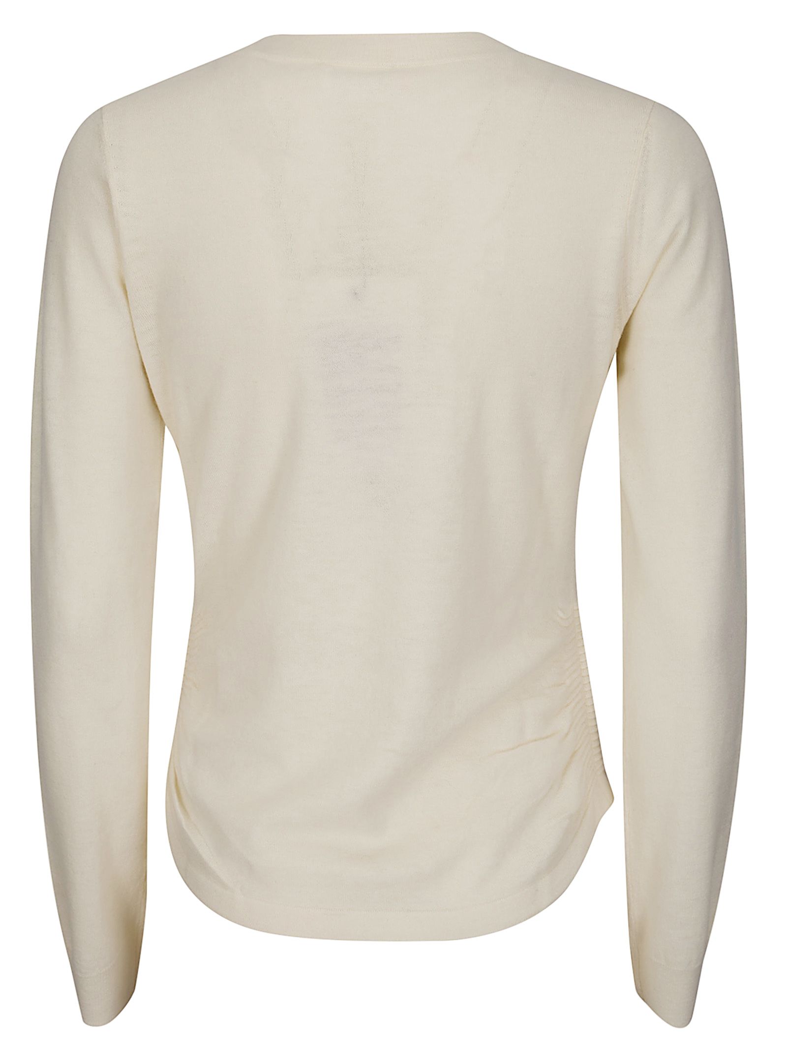 Maglia girocollo, maniche lunghe, silhouette aderente, arricciature sulle cuciture laterali, logo Baum ricamato sul petto.