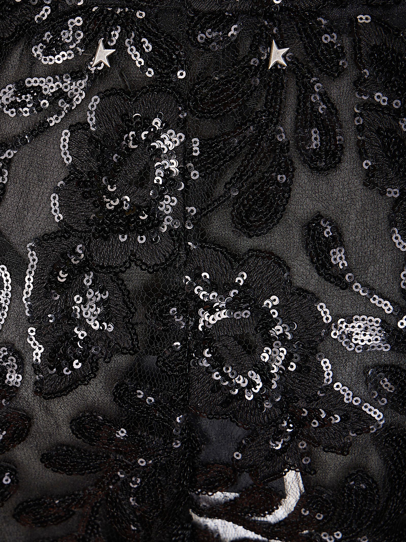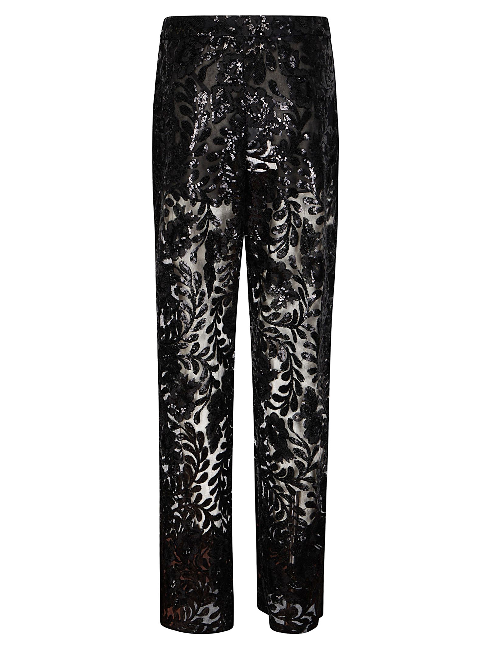 Pantaloni in tulle nero decorato con un ricamo floreale all-over in paillettes di colore nero, chiusura con zip invisibile in nylon, fodera interna stile culotte in crêpe ton sur ton, vestibilità ampia.