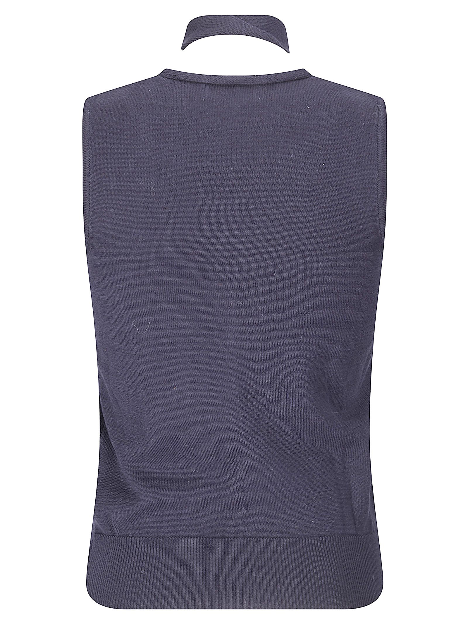 Gilet senza maniche in maglia con scollo a V, chiusura con bottoni, dettaglio della cravatta