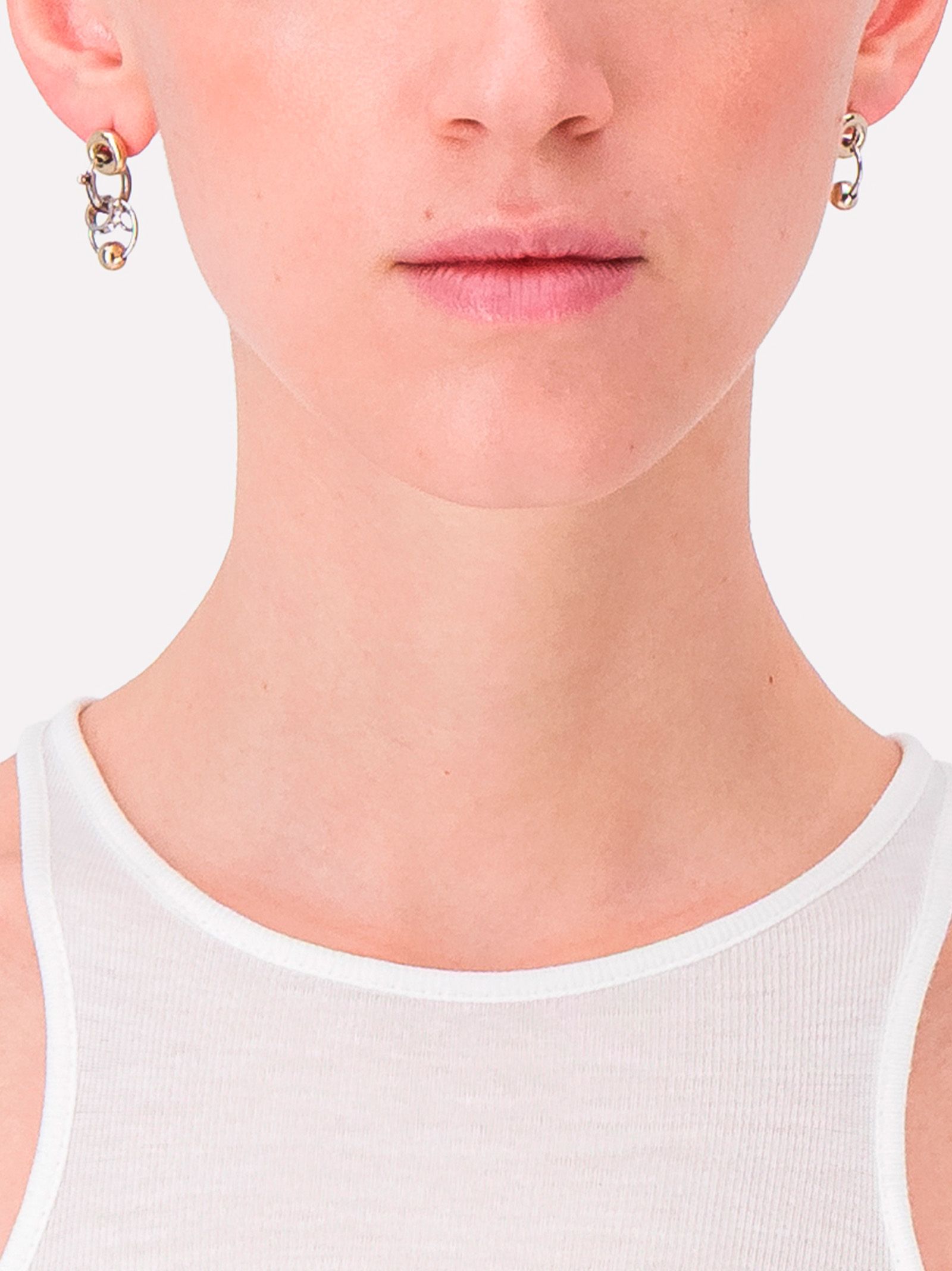 Coppia di orecchini asimmetrici argento e oro, anellini misti, chiusura con farfallina, piccoli.