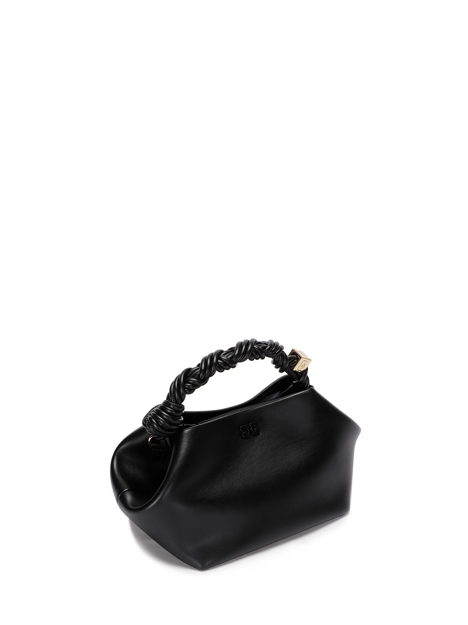 Mittelgroße sechseckige Tasche mit geflochtenem Griff und goldenem Anhänger sowie aufgesetztem Logo.
