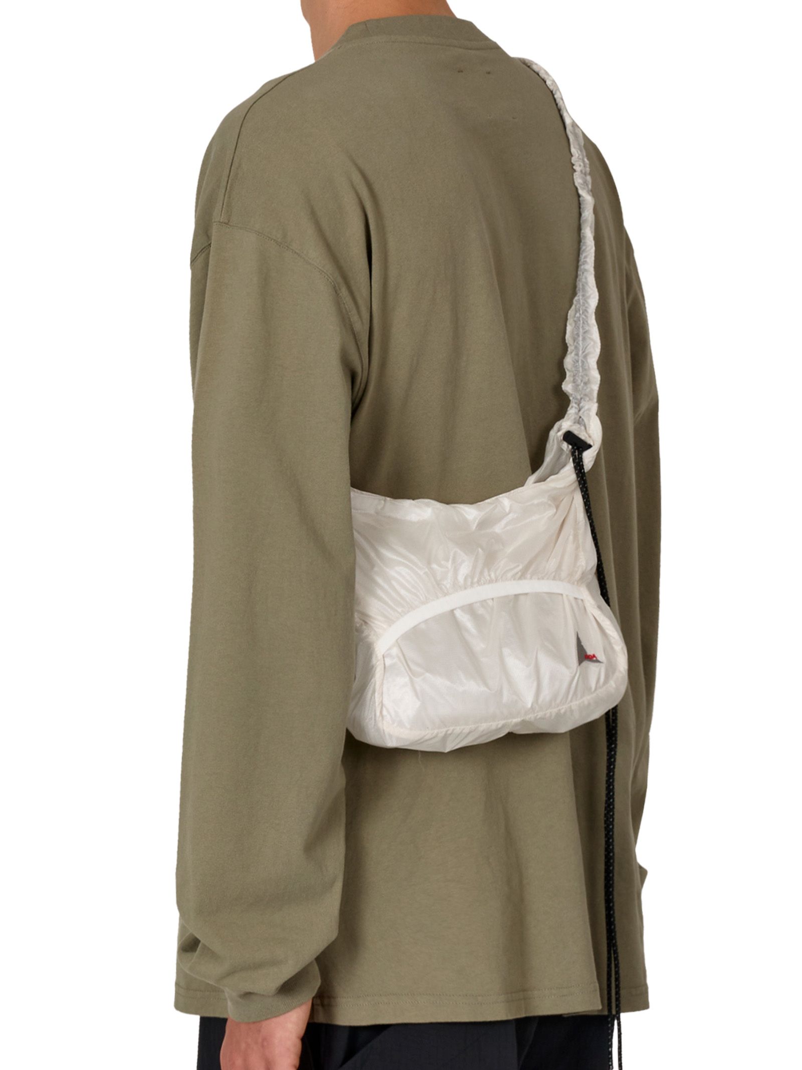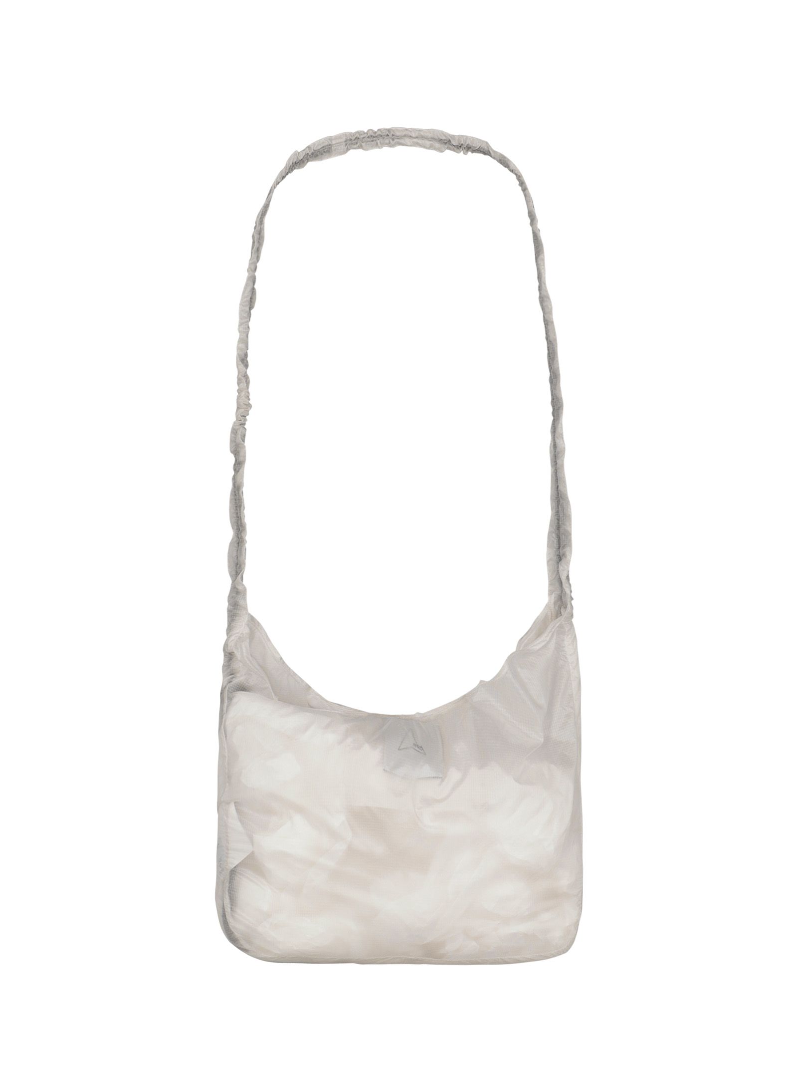 Kleine Tasche aus Synthetikgewebe, verstellbarer Schultergurt mit Kordelzug, transparentes Gewebe, geeignet für leichte Gegenstände.