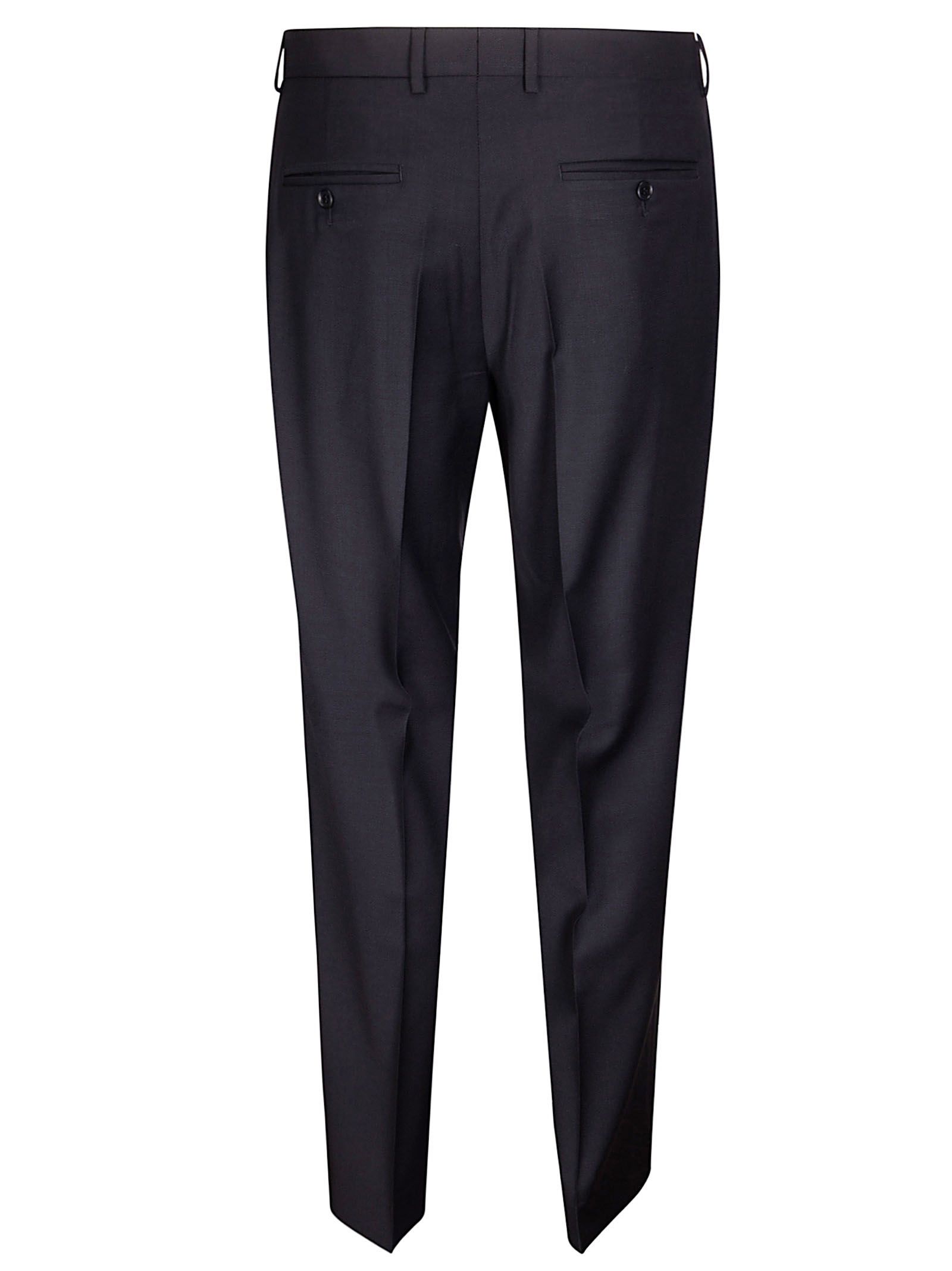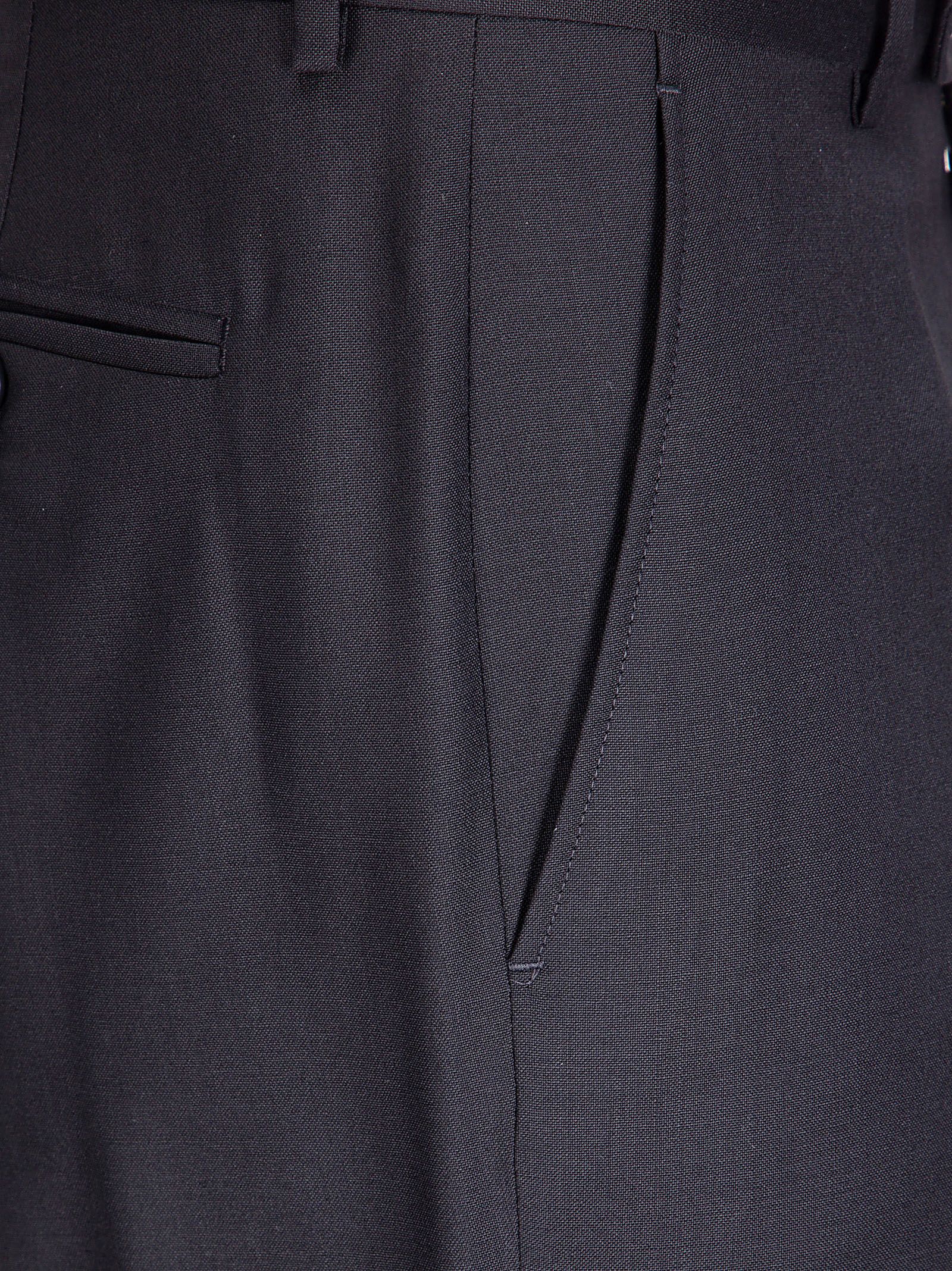 Pantaloni in lana leggera, design classico, riga frontale, chiusura con bottone e zip, gamba dritta.