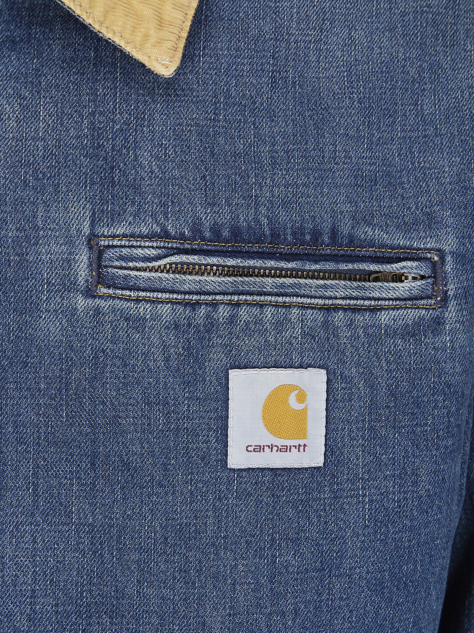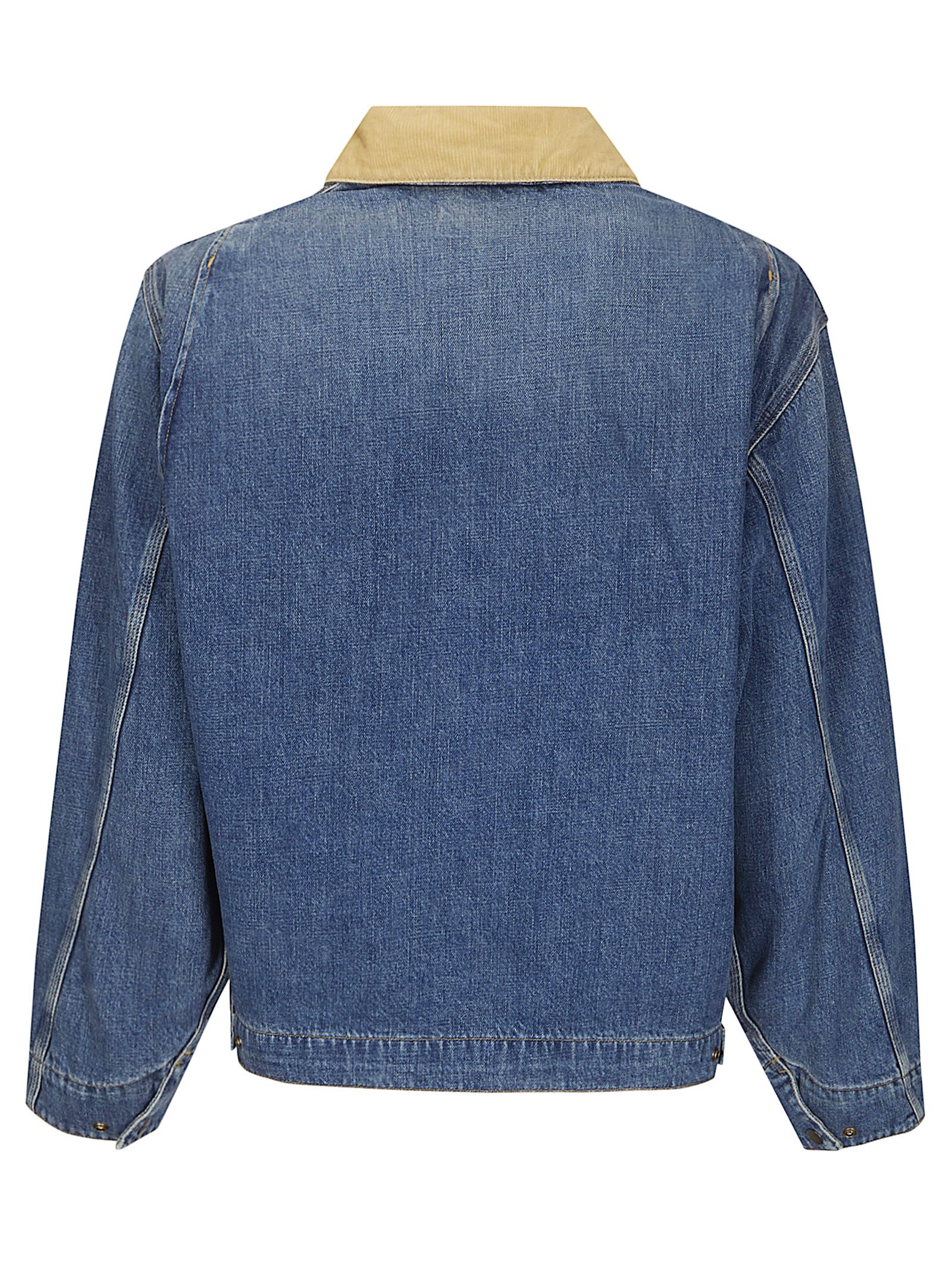Giacca denim con collo in velluto a contrasto, chiusura con cerniera, tasca sul petto con cerniera, due tasche sul davanti, vestibilità ampia