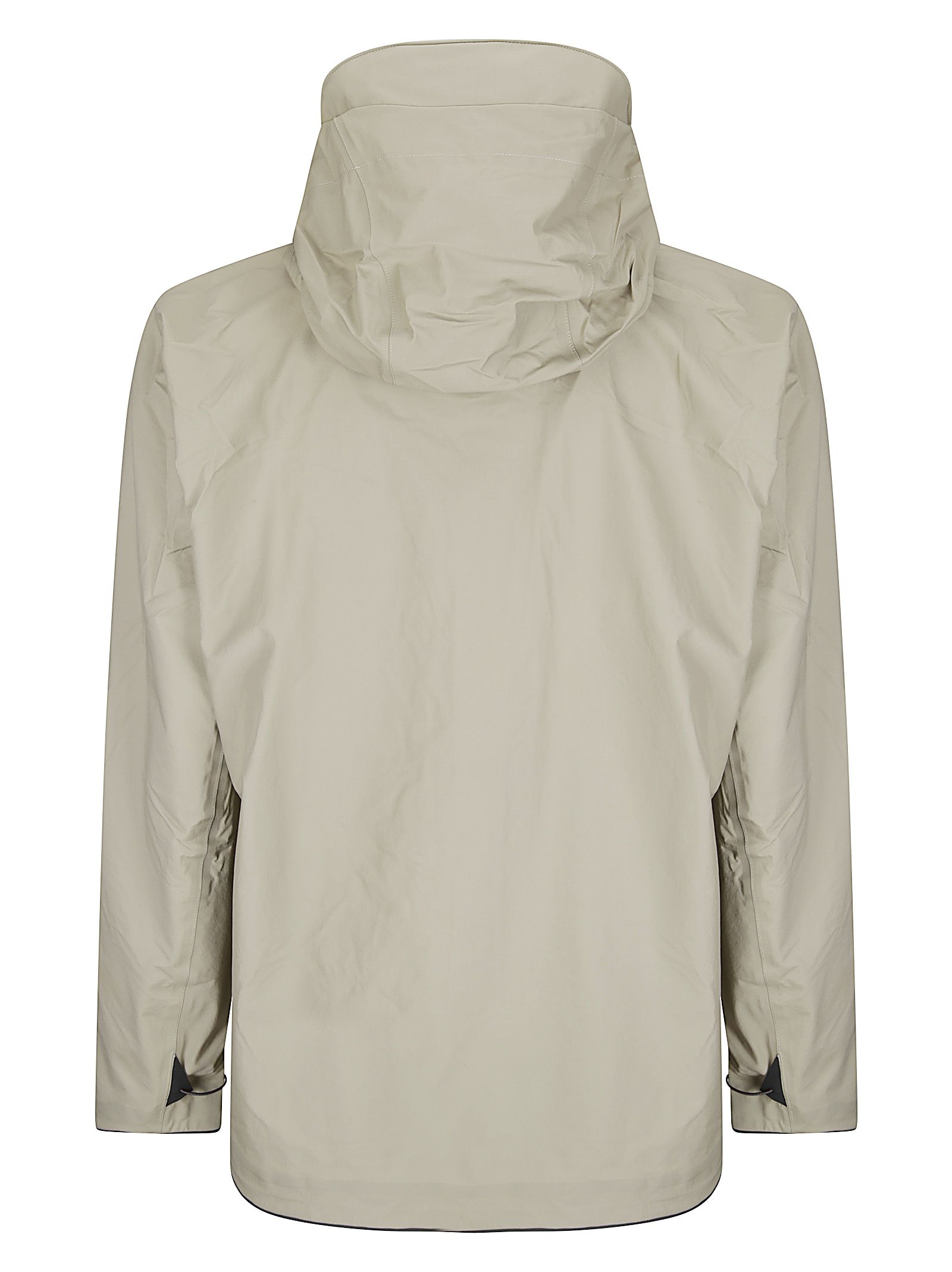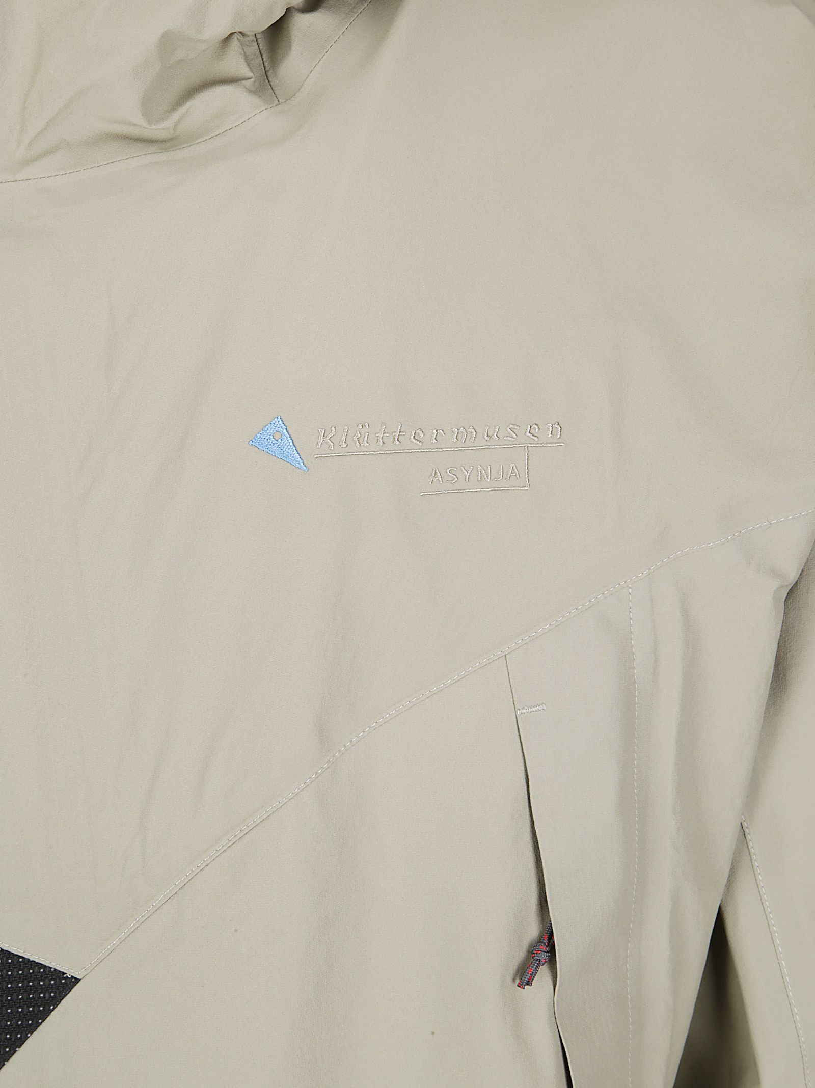 Technische Jacke für kaltes Klima, verdeckter Reißverschluss, Kapuze mit Schirm, Stickerei auf der Brust.