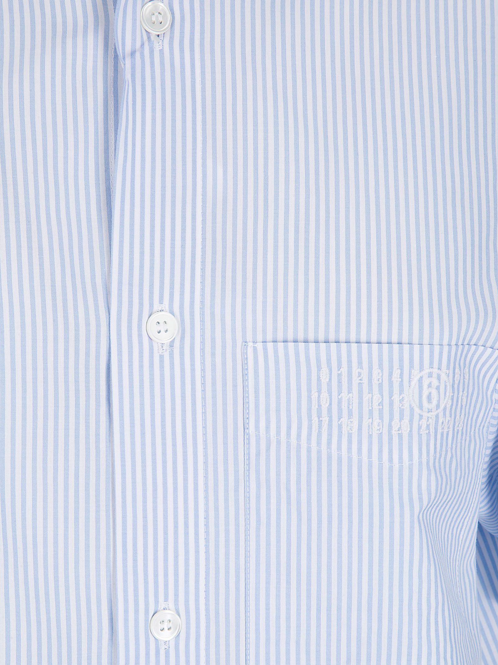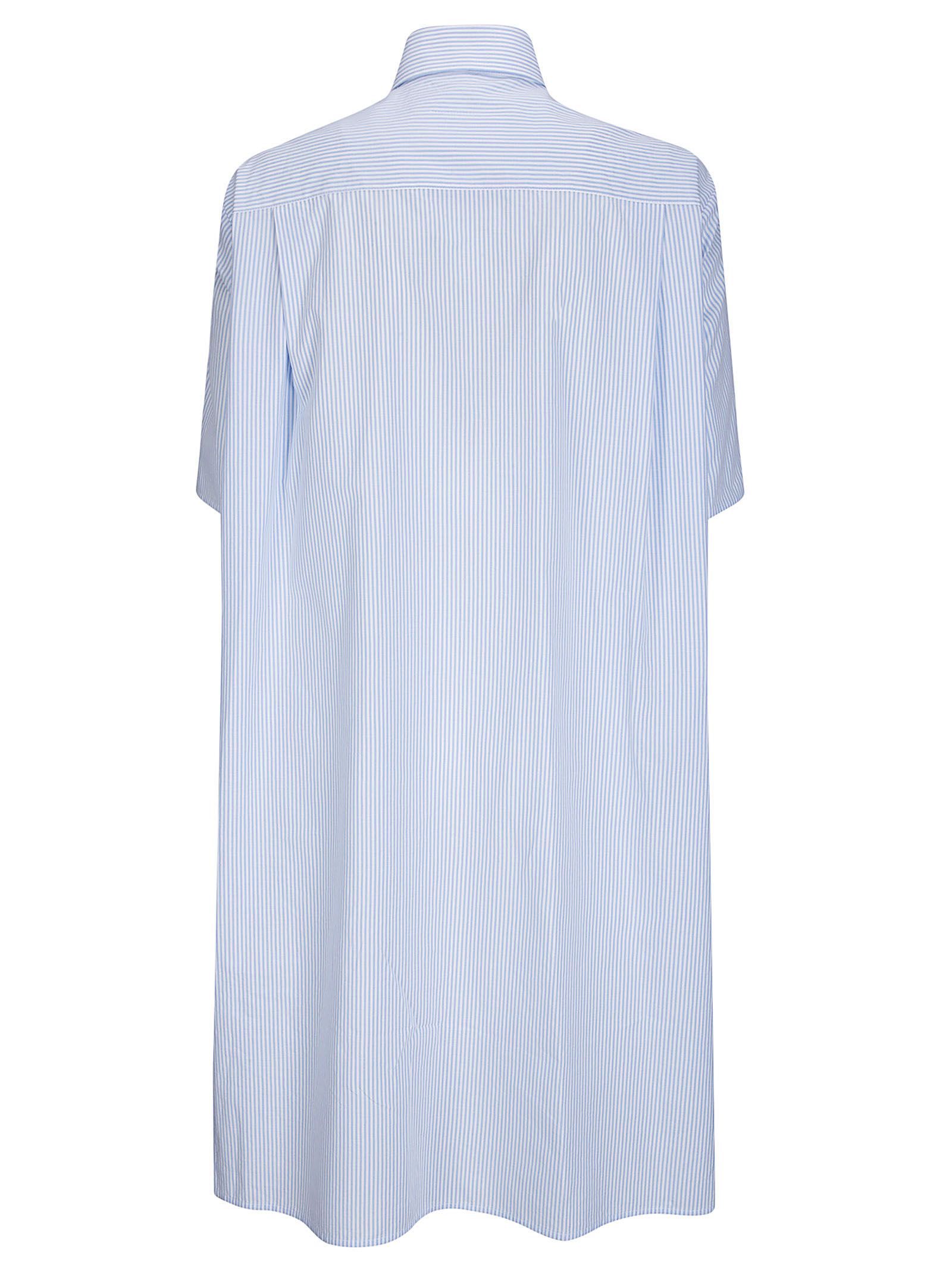Abito midi a righe, colletto a camicia, apertura frontale con bottoni, taschino sul petto con logo ricamato, tasche laterali e maniche corte.