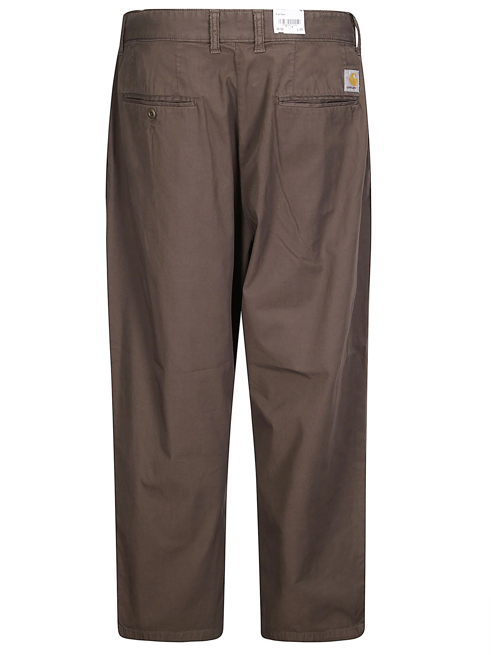 Mid-rise, high-waisted pleated trousers, two side pockets, two back pockets, zip fastening, belt loops, loose fit.