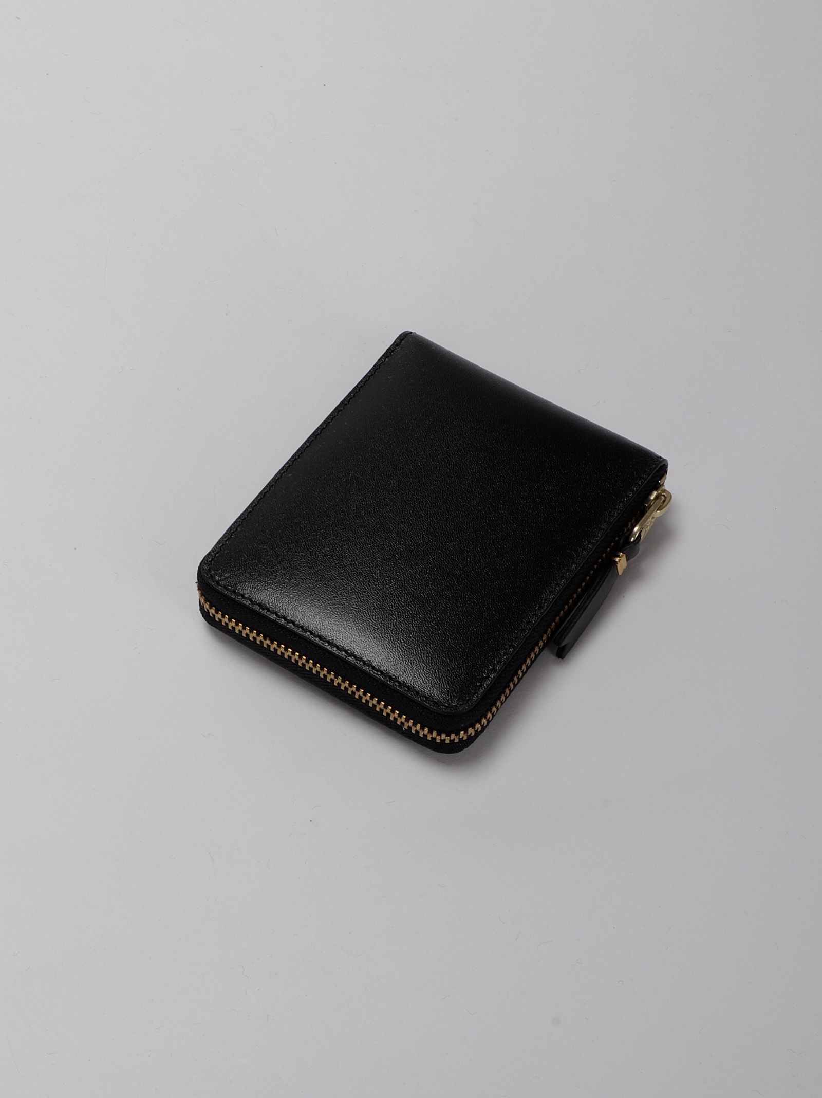 Simple black wallet with gold zip, internal compartments for cards and coins.
