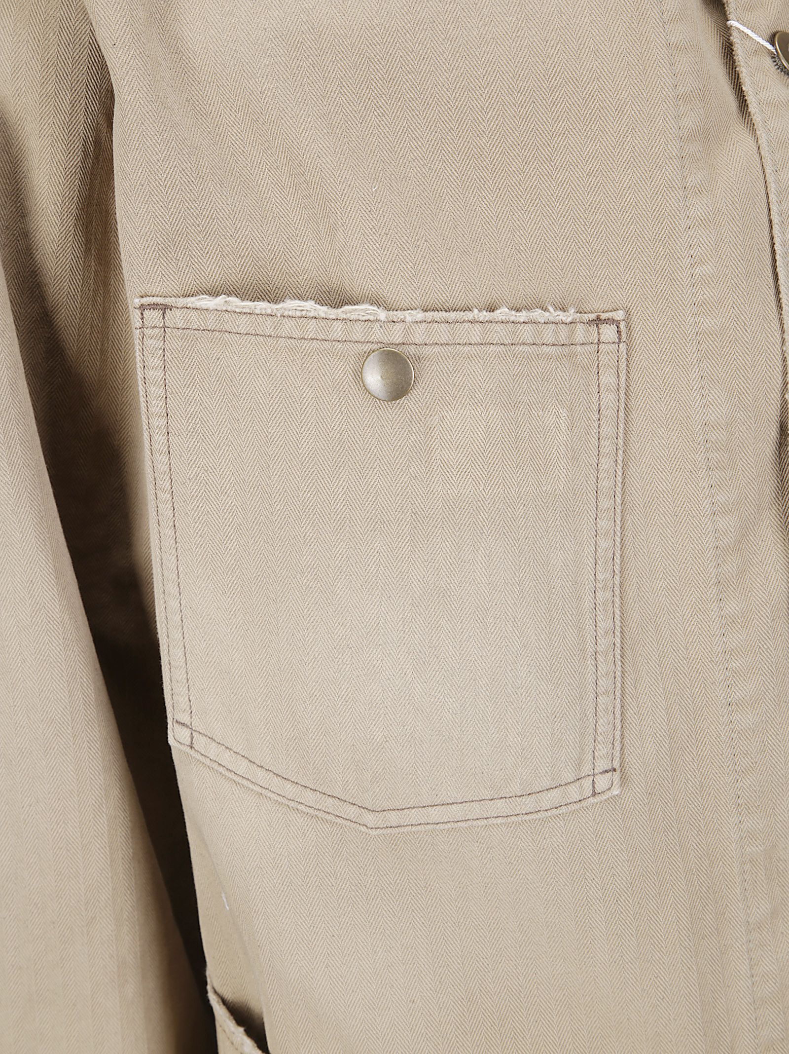 Work-effect design jacket in denim-effect cotton, oversized fit, front button fastening, small collar, large pockets.