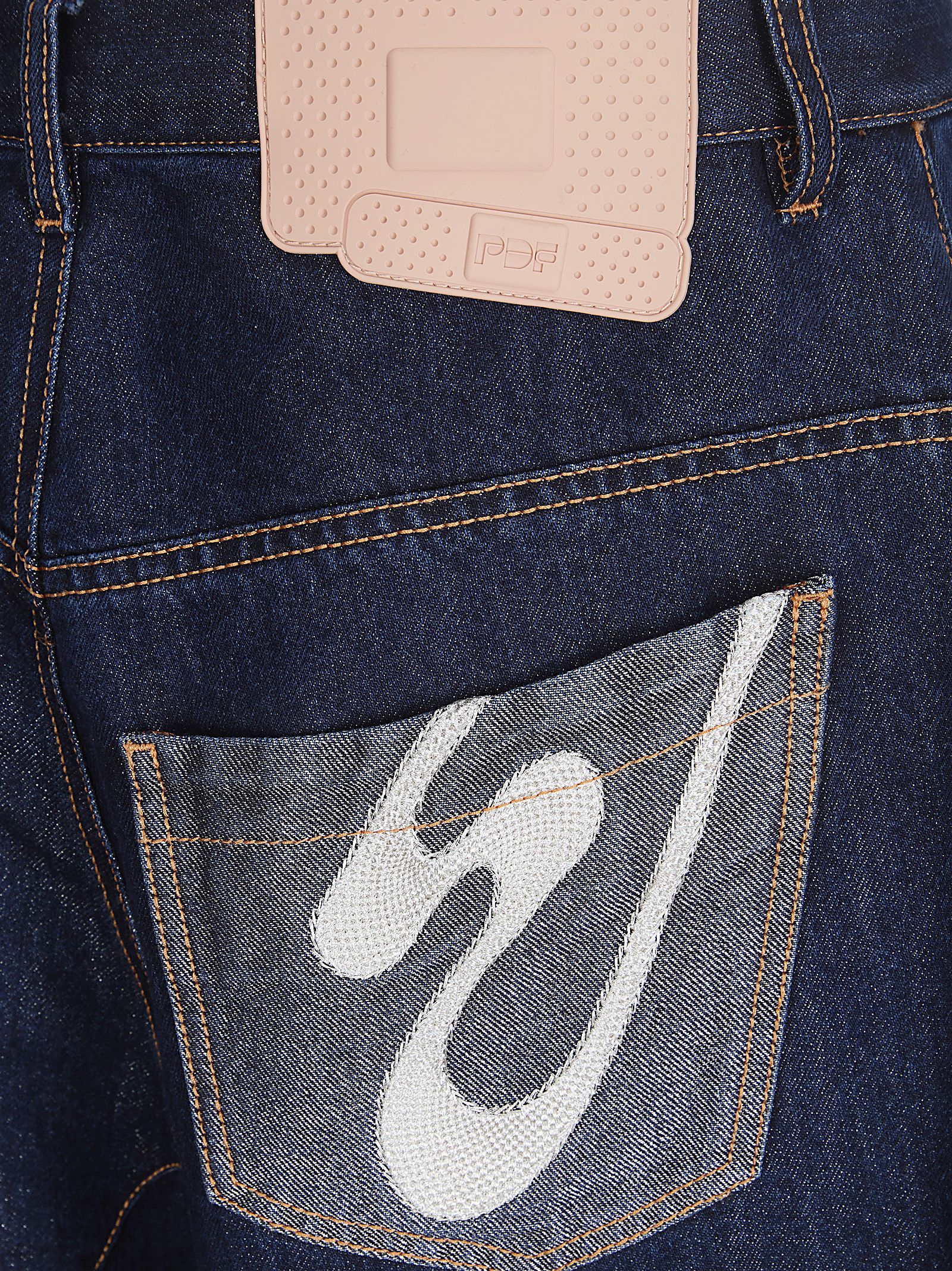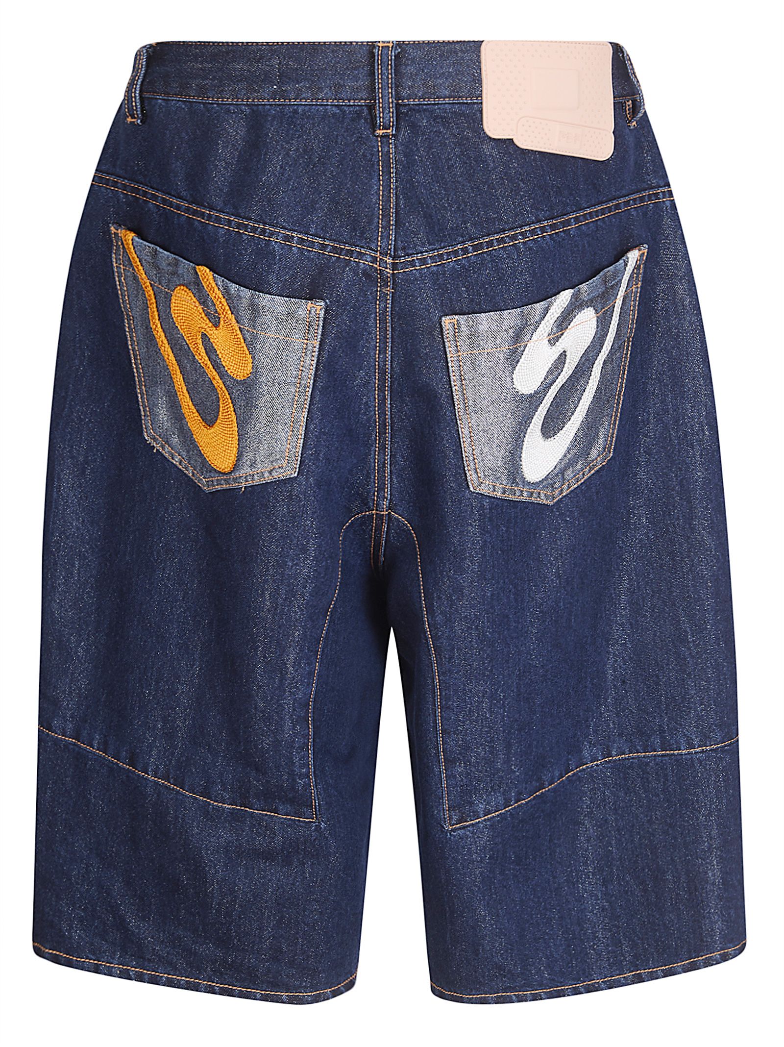 Loose-fit denim shorts with orange contrast stitching and embroidered back pockets.