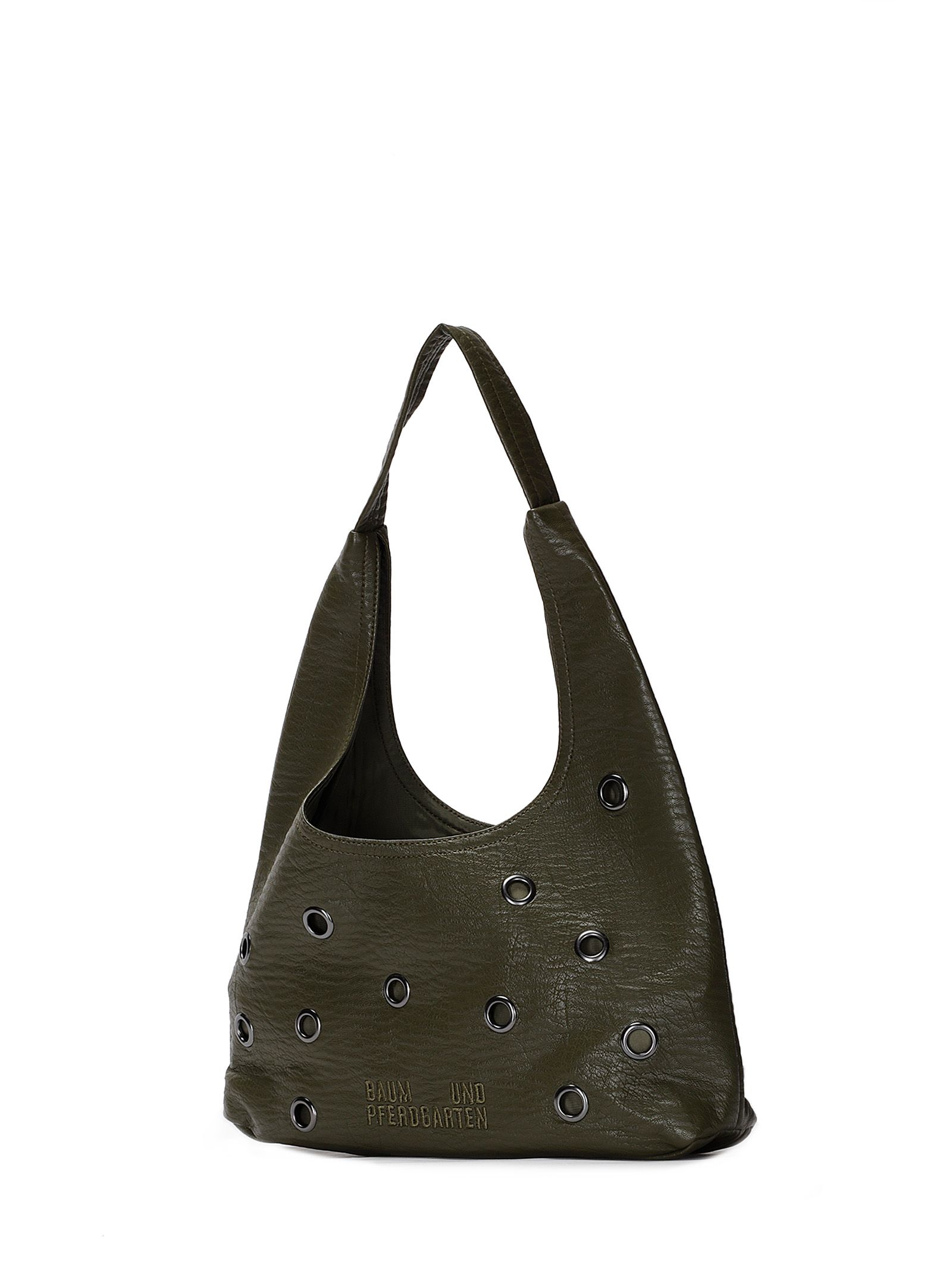Borsa a mano con chiusura magnetica, scomparto interno spazioso, dettaglio borchie.