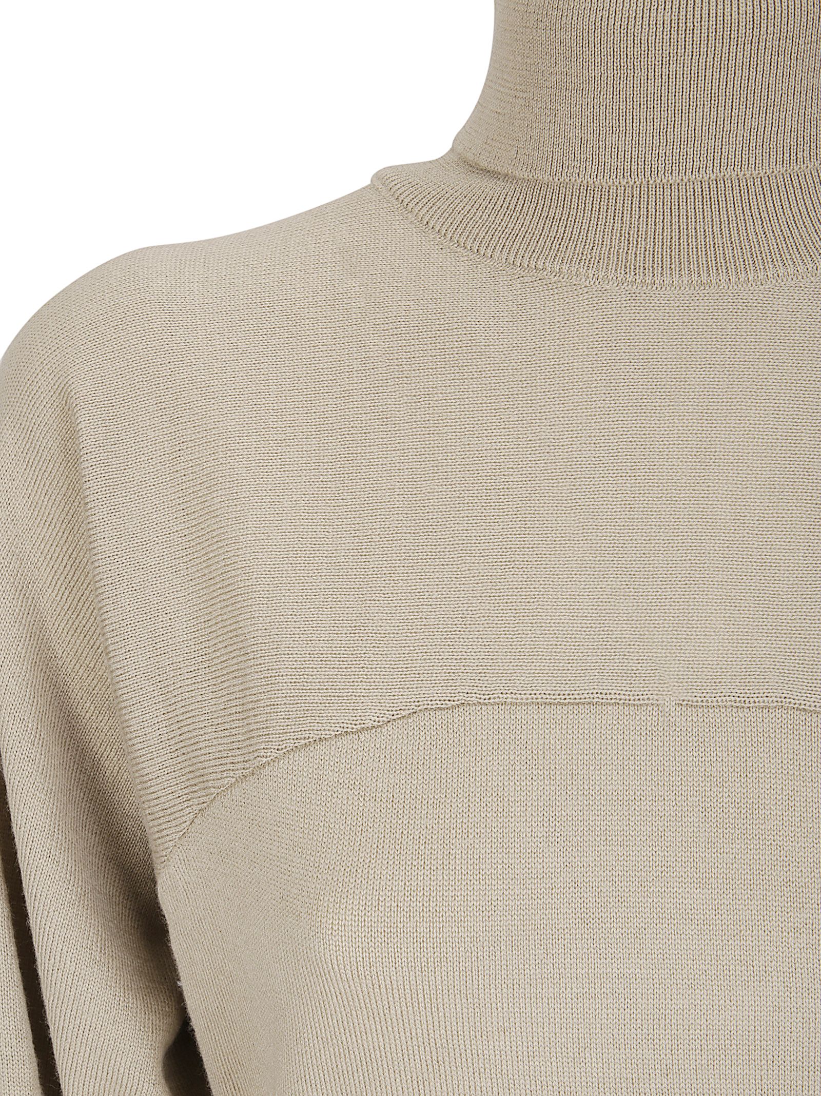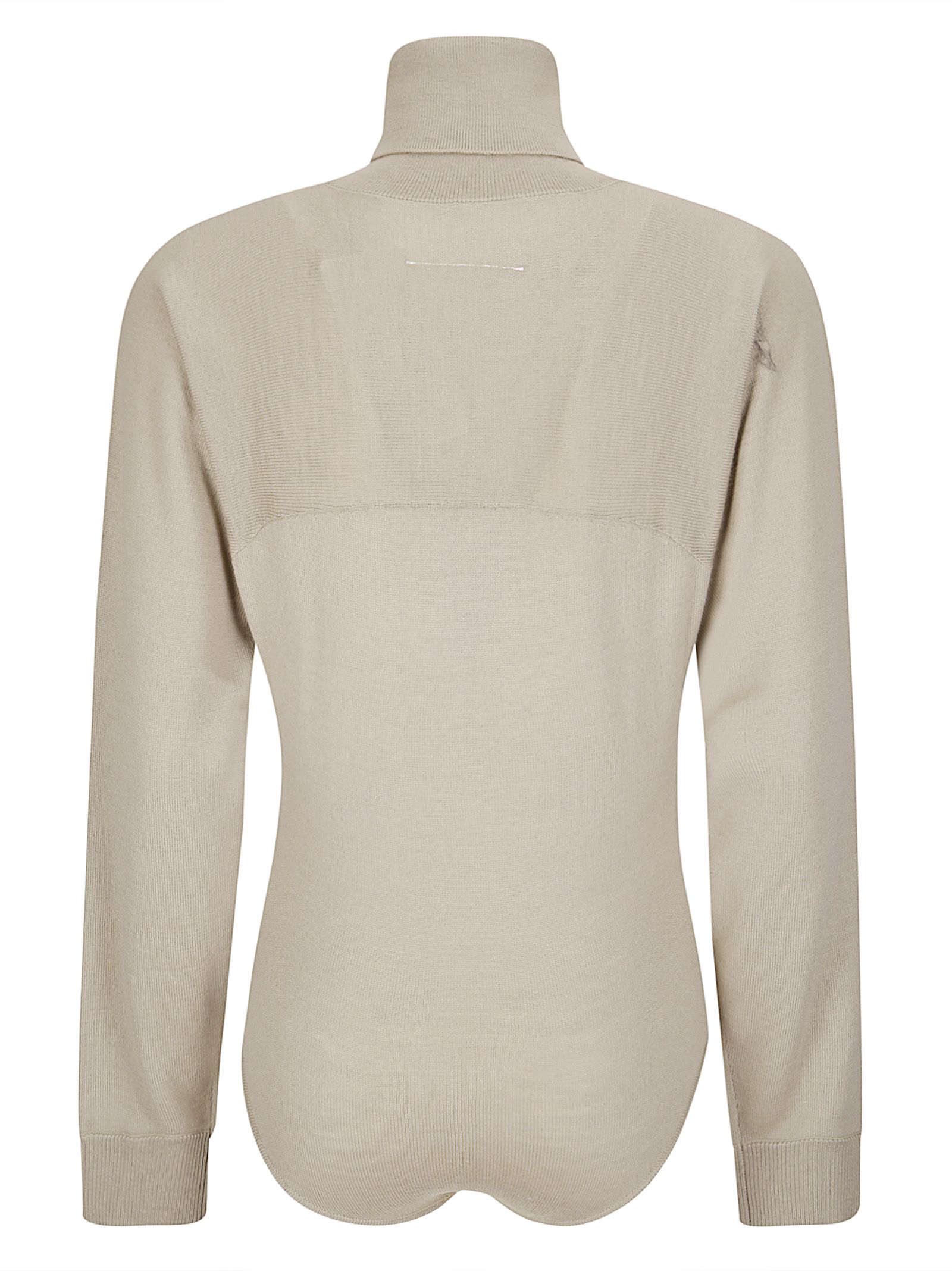 Bodysuit top with turtleneck, long batwing sleeves, snap button fastening.
