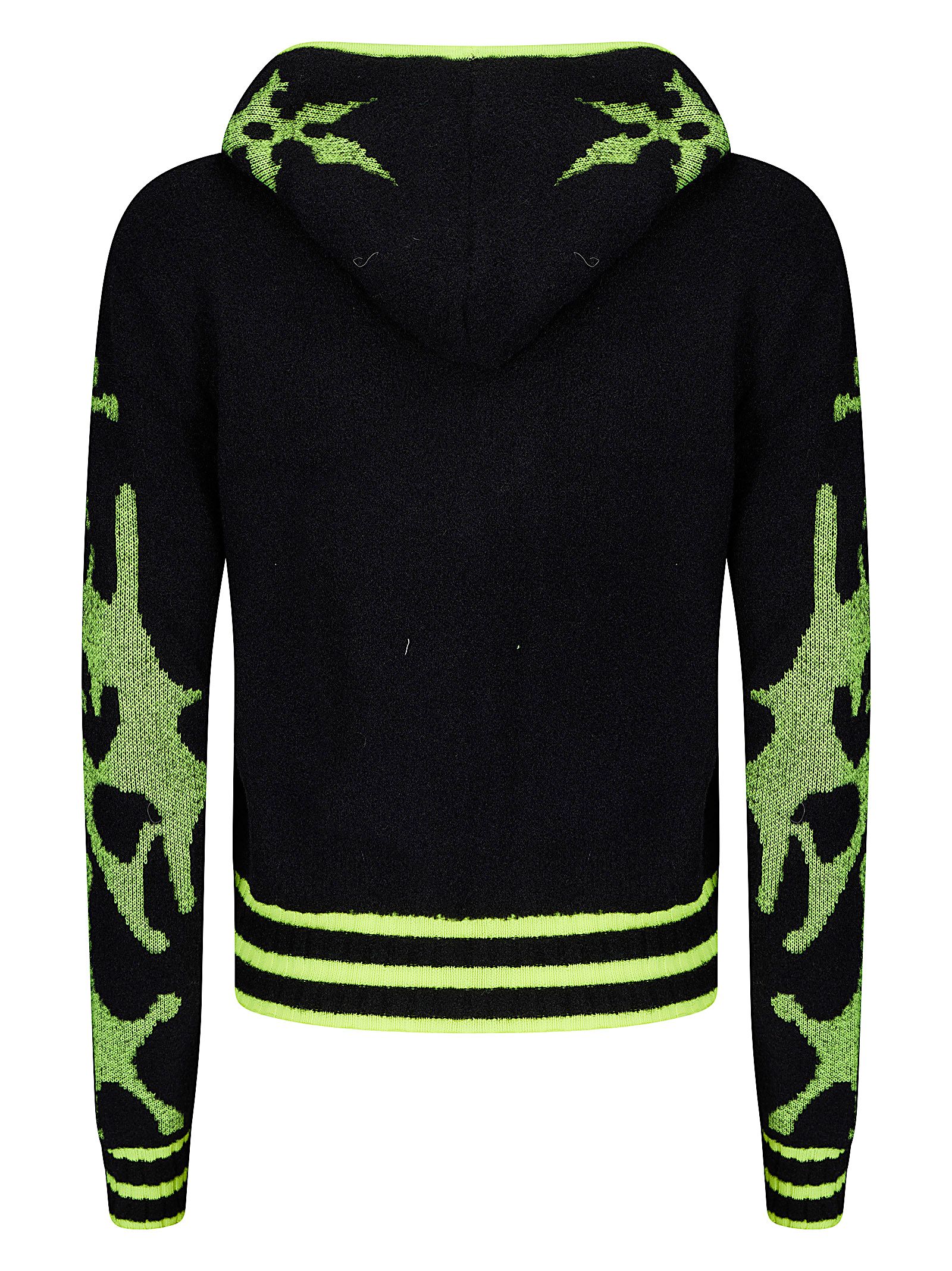 Cardigan nero con cappuccio in maglia, grafica intarsiata gialla, chiusura con cerniera con tirazip con ciondolo a forma di cuore.