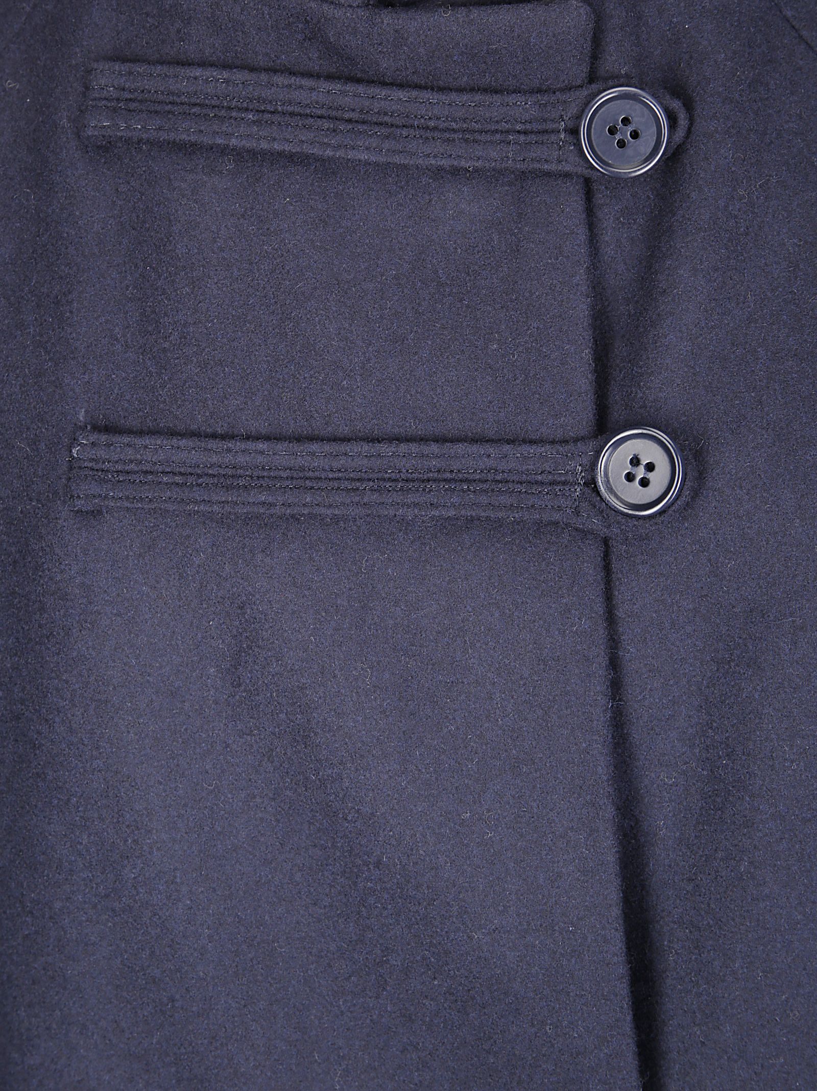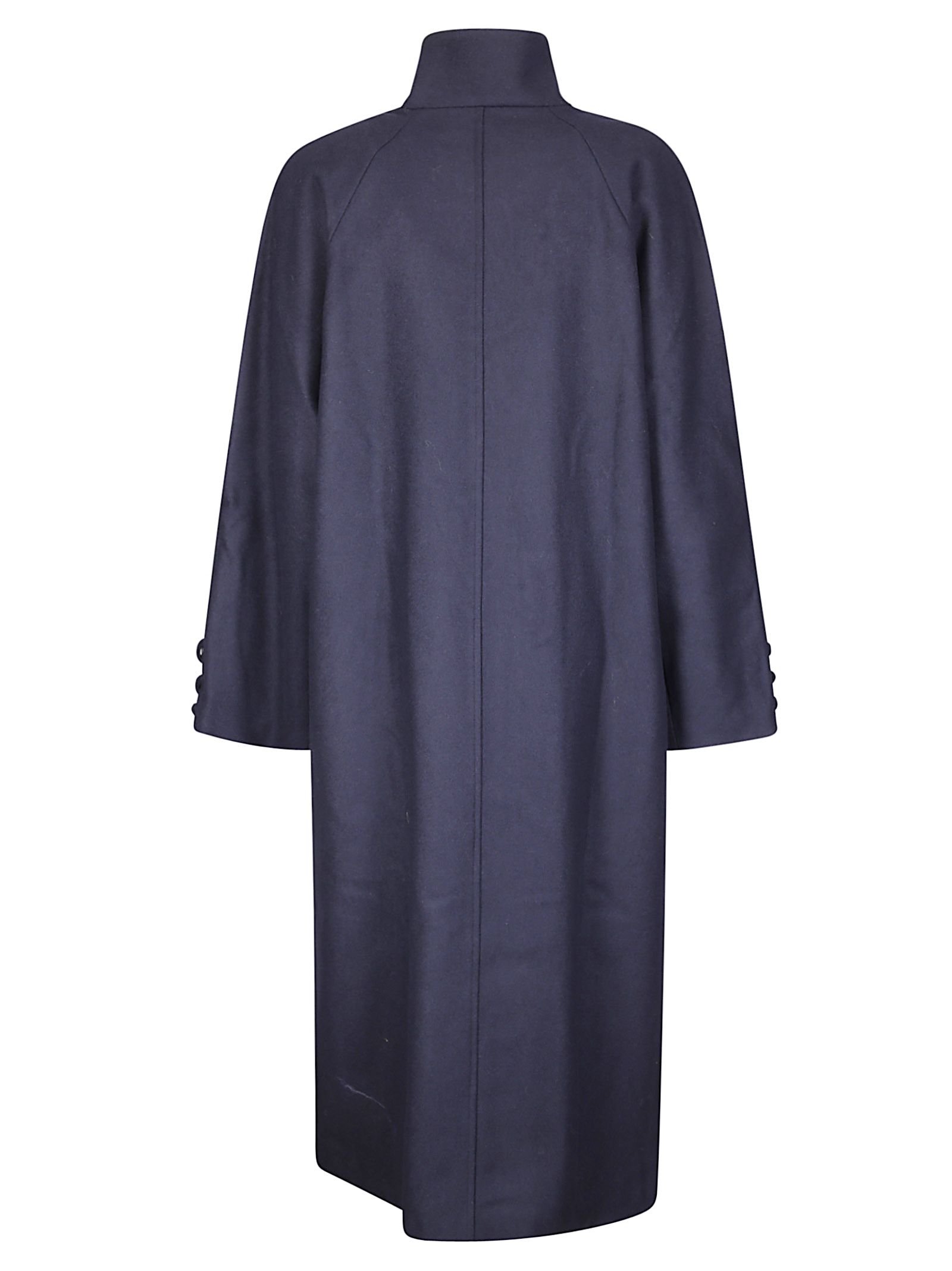 Cappotto doppiopetto realizzato in misto lana e cashmere leggermente strutturato, vestibilità dritta, due tasche laterali oblique e collo alto.
