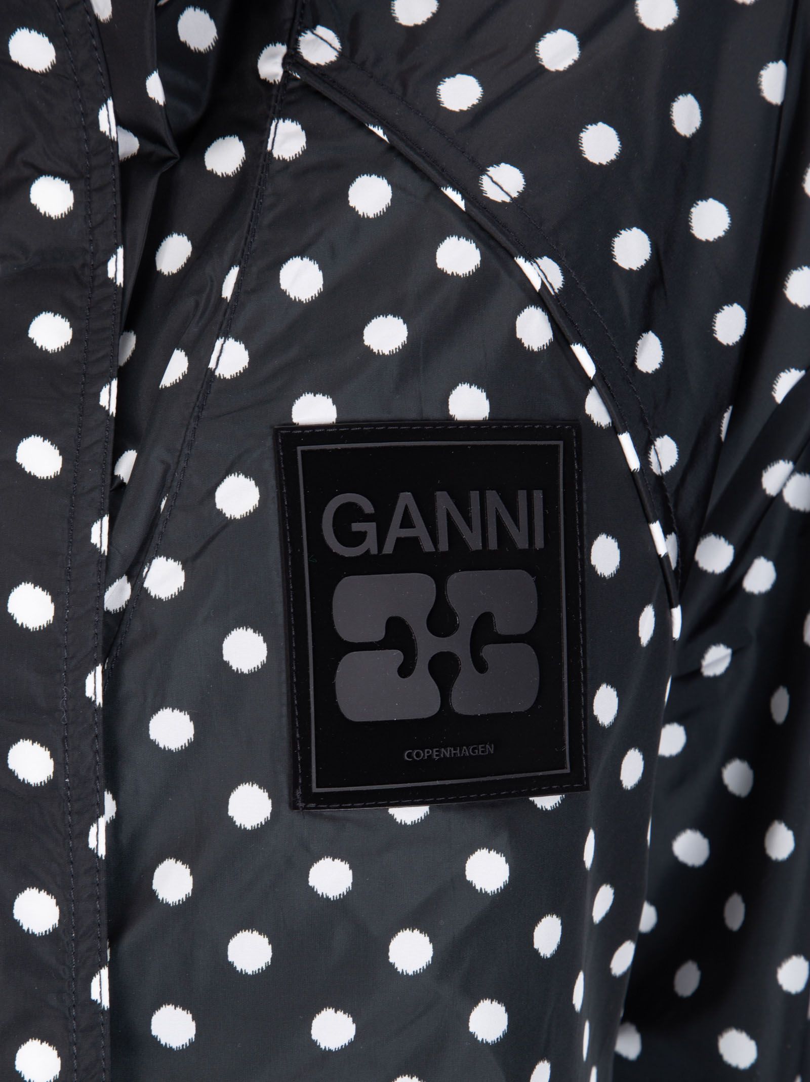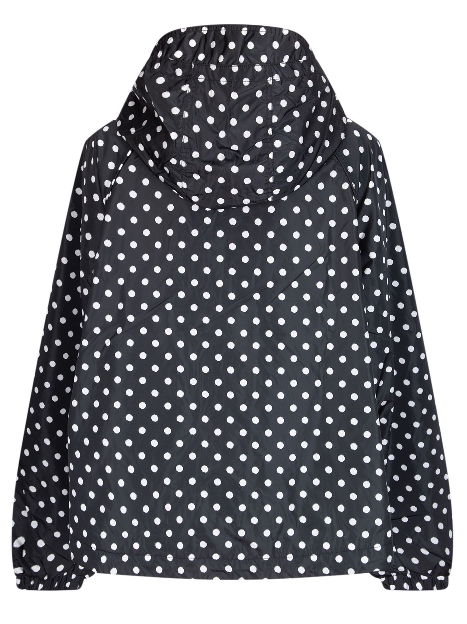 Polka dot nylon jacket with hood, zip and button fastening, side pockets and elasticated drawstring at the bottom.