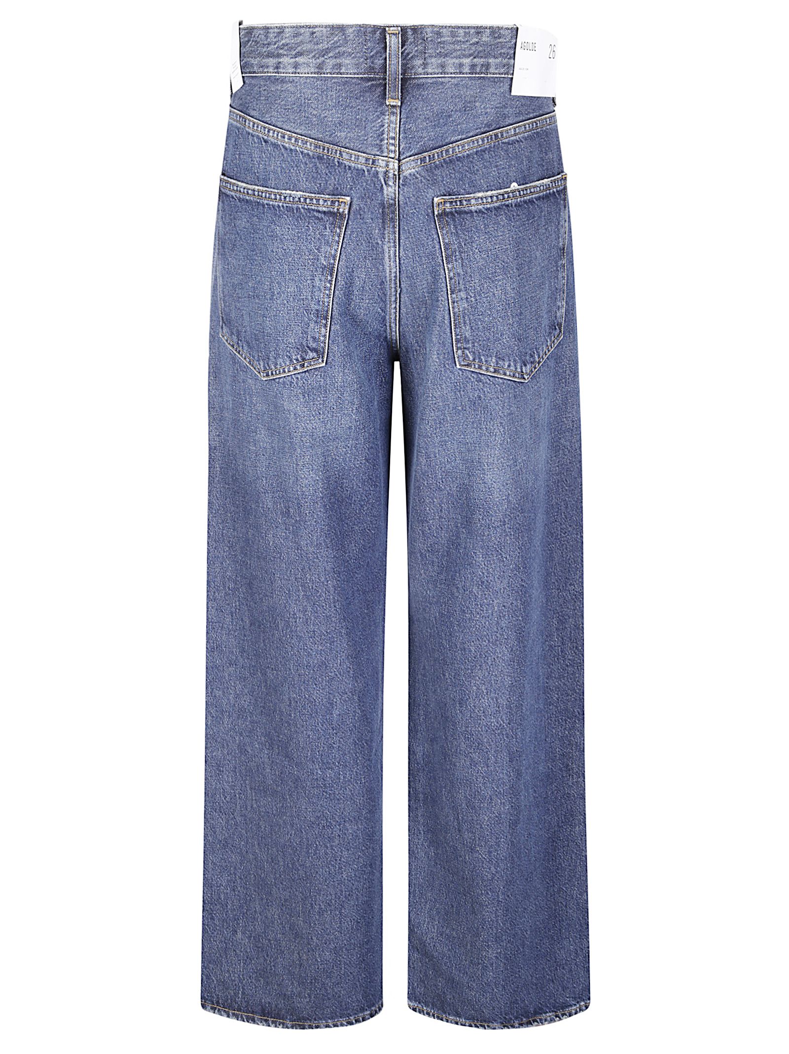 Jeans cinque tasche in denim di cotone, chiusura zip e bottone e gancio, gamba ampia e dritta.