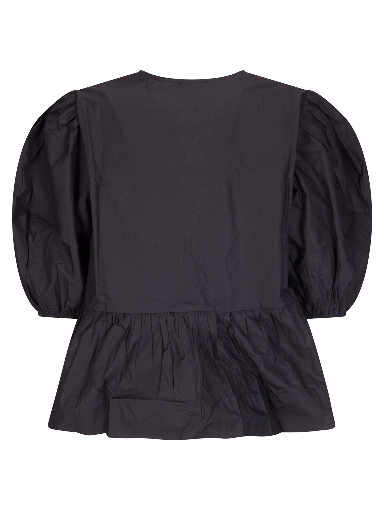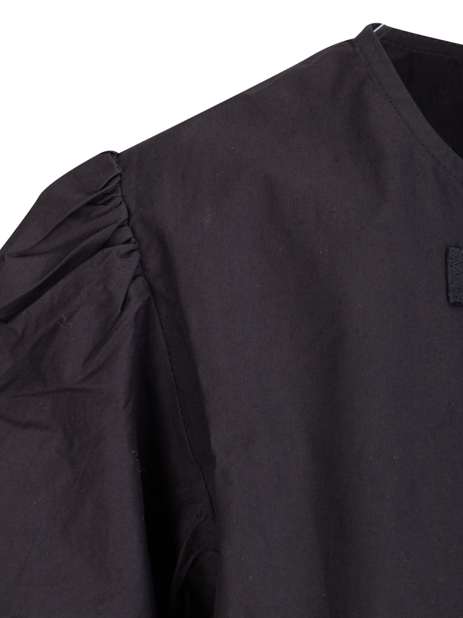 shirt with open round neckline with ribbons to tie, puff sleeves with elastic edges and flared bottom