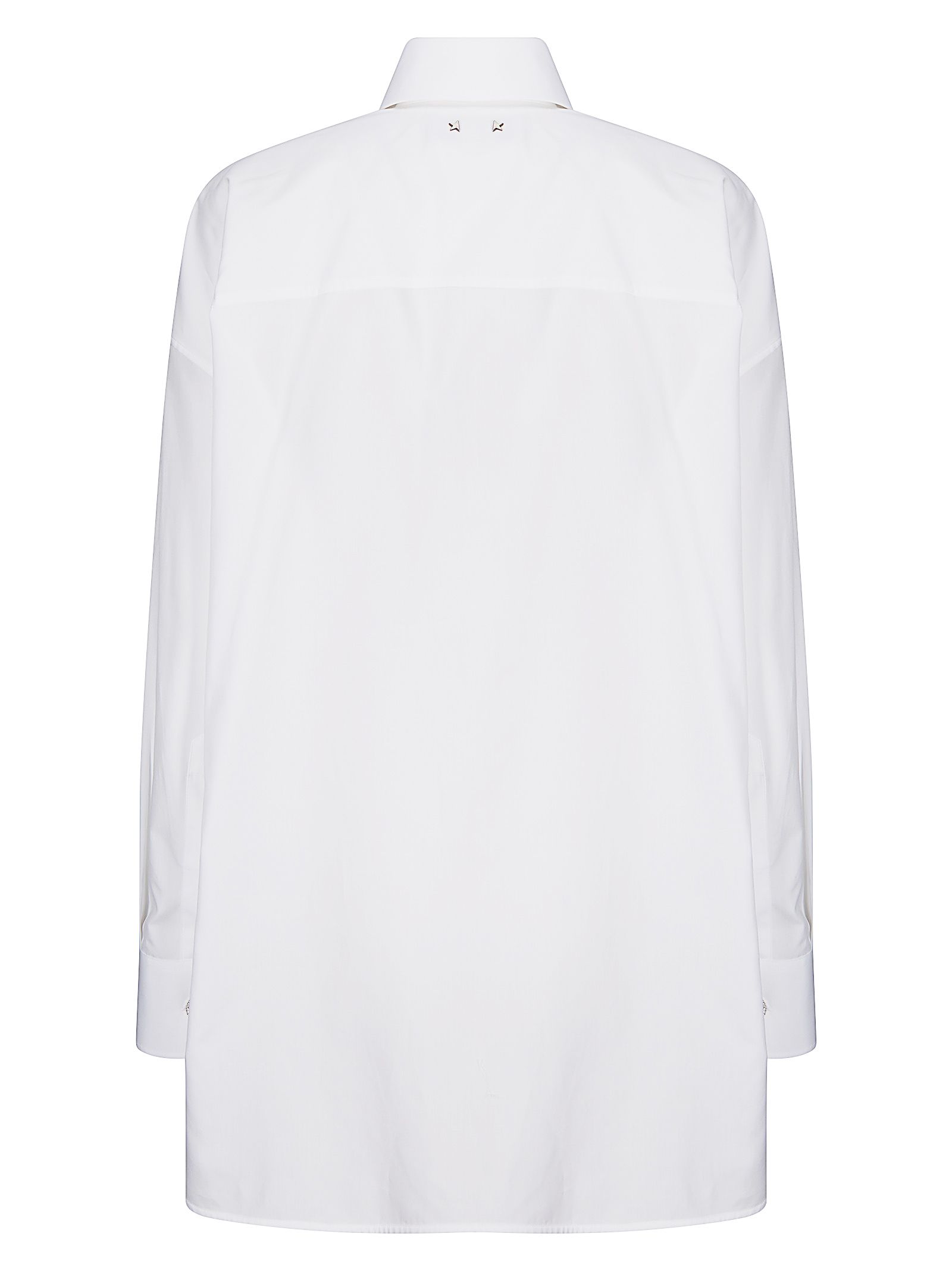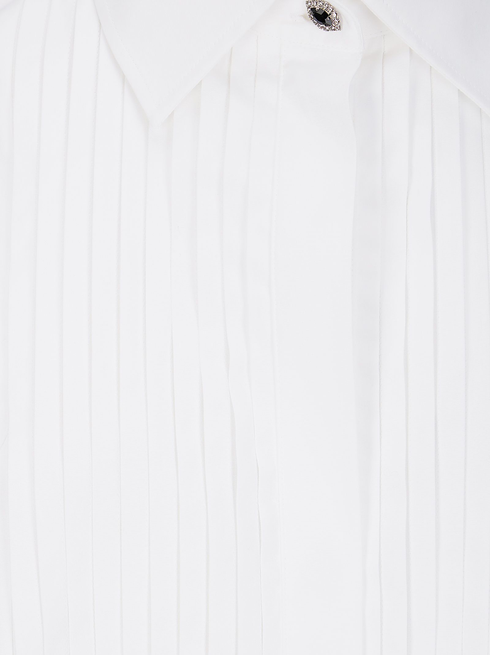 Camicia realizzata in popeline di cotone bianco, pettorina plissé sul davanti e polsini gioiello, chiusura effetto nascosto con bottoni in madreperla, fit oversized.