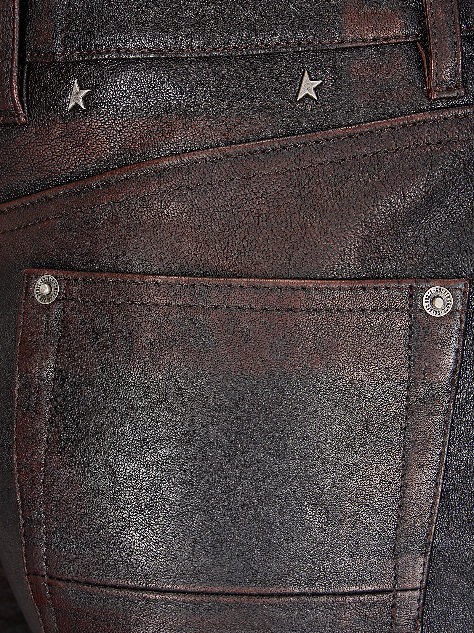 Pantaloni in nappa cinque tasche, chiusura frontale con bottone e zip, fit slim dritto, doppia stellina sul retro.