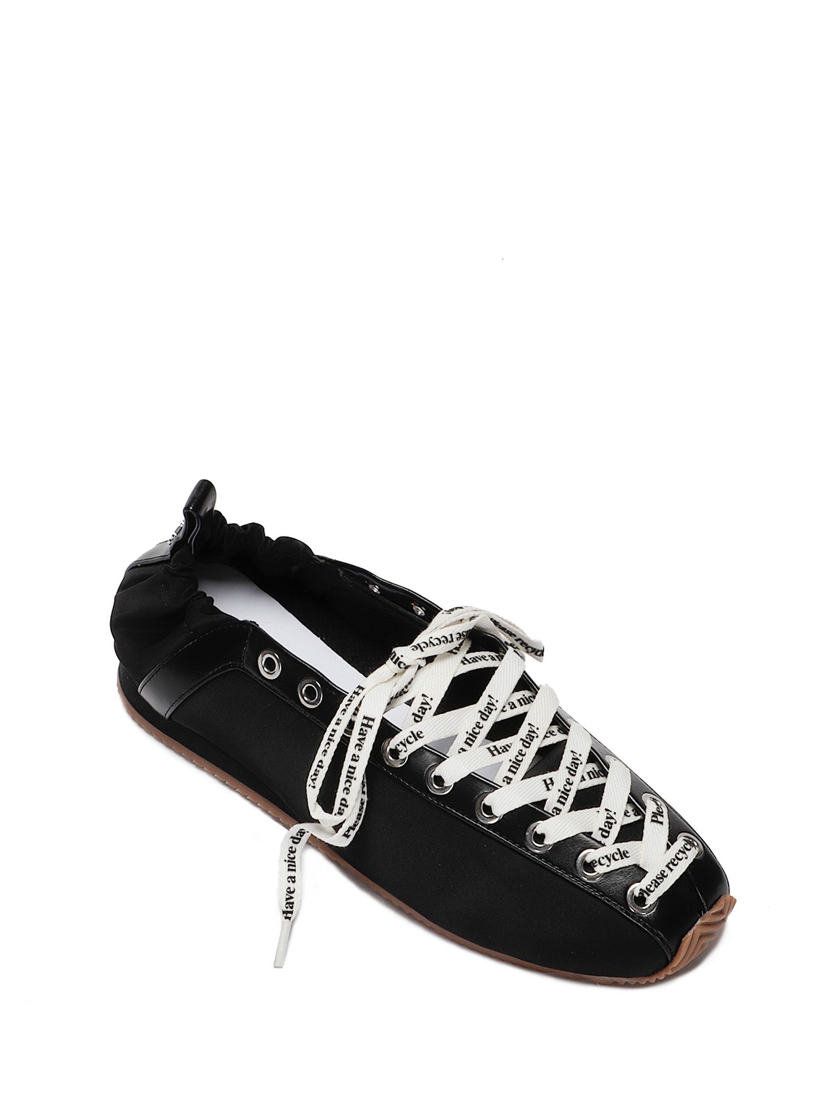 Lace-up ballerinas with fabric upper, square toe, rubber sole, elastic on the heel, tongue with applied silver-colored logo.