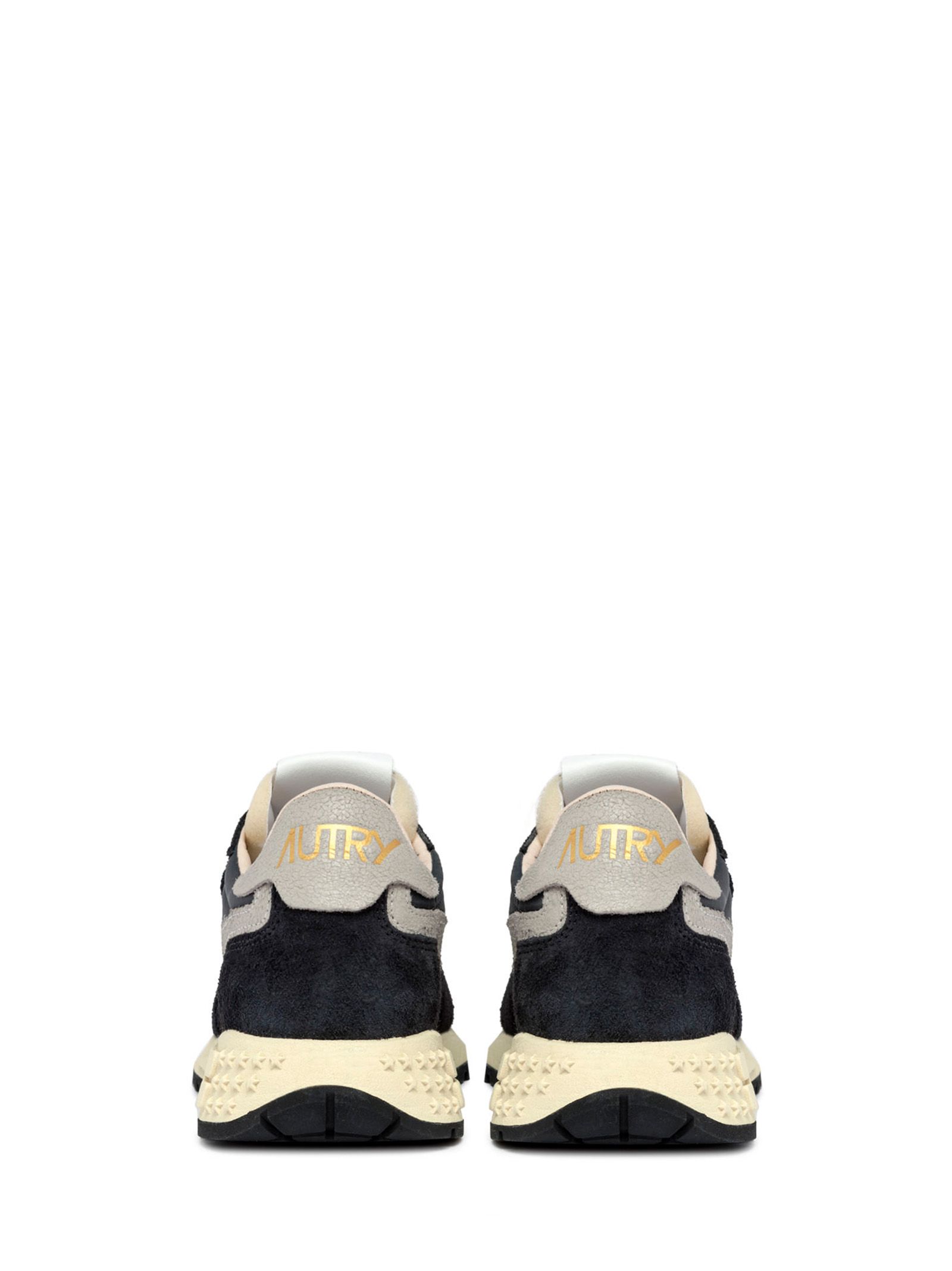 Sneakers in faded black suede, grey heel in rough leather, grey laces, rubber sole.