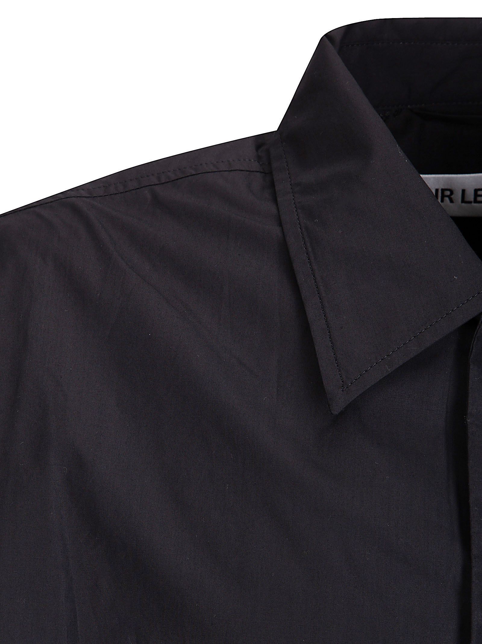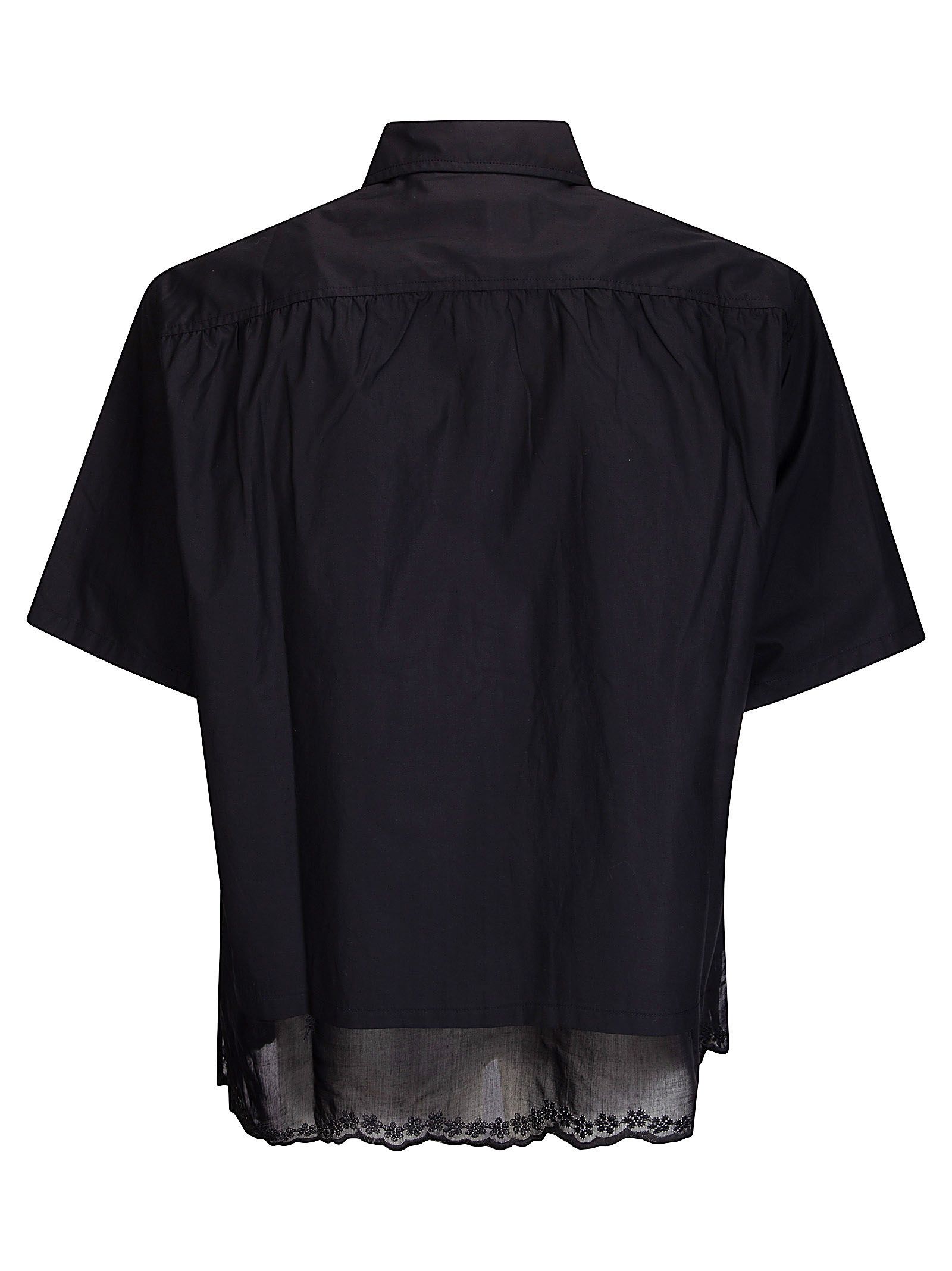 Camicia oversized in cotone con pannello ricamato, chiusura con bottoni in in madreperla, colletto regolare, taschino frontale.