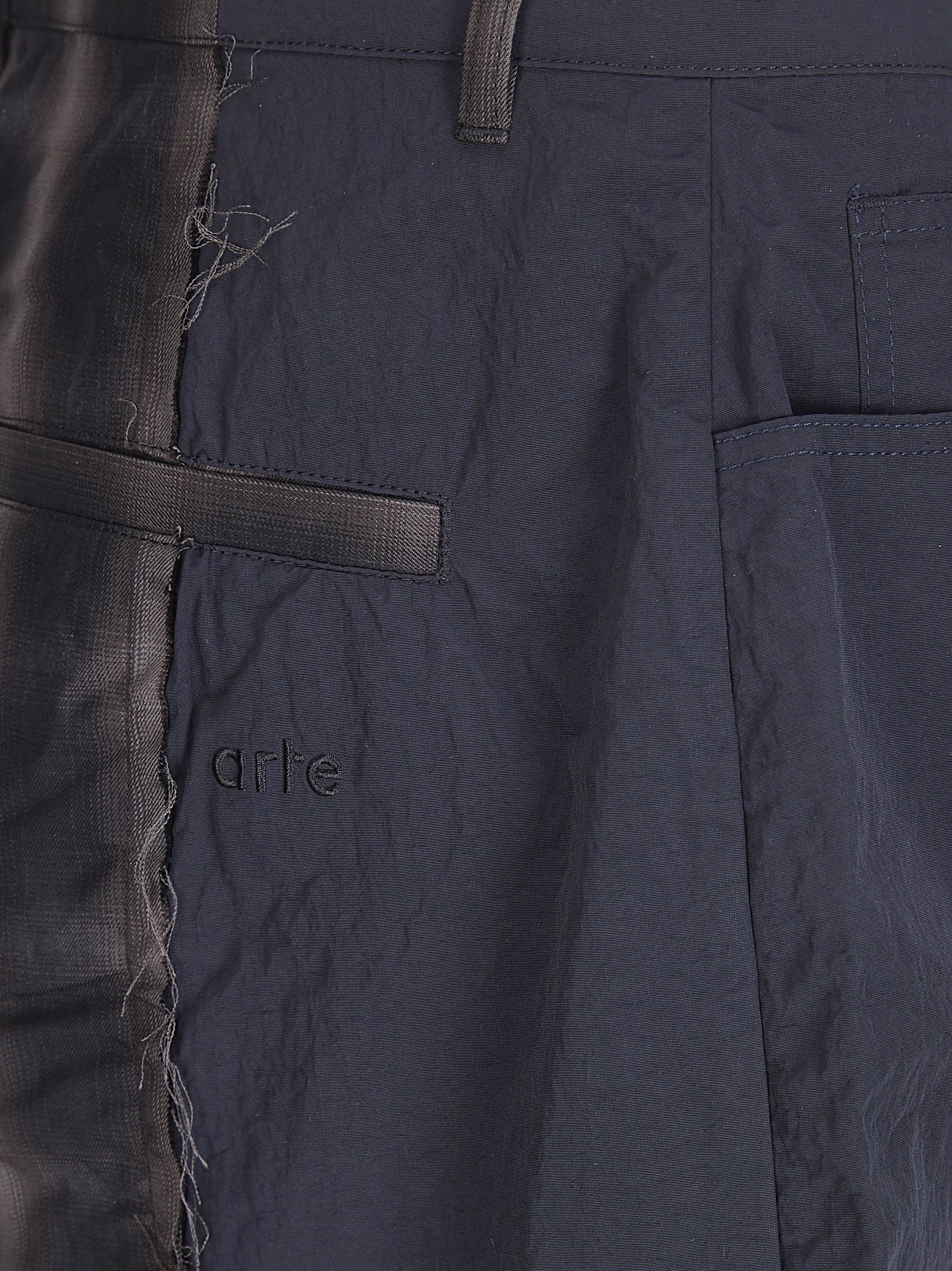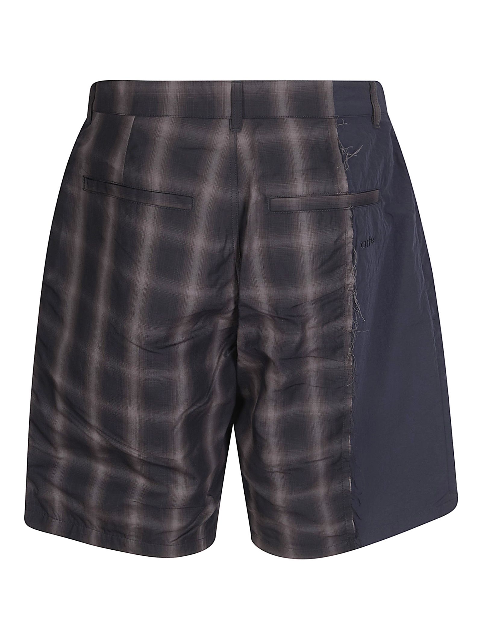Pantalone bermuda con chiusura con bottone e zip, cinque tasche, tessuto a contrasto sul fianco, dettaglio logo ricamato sul retro.