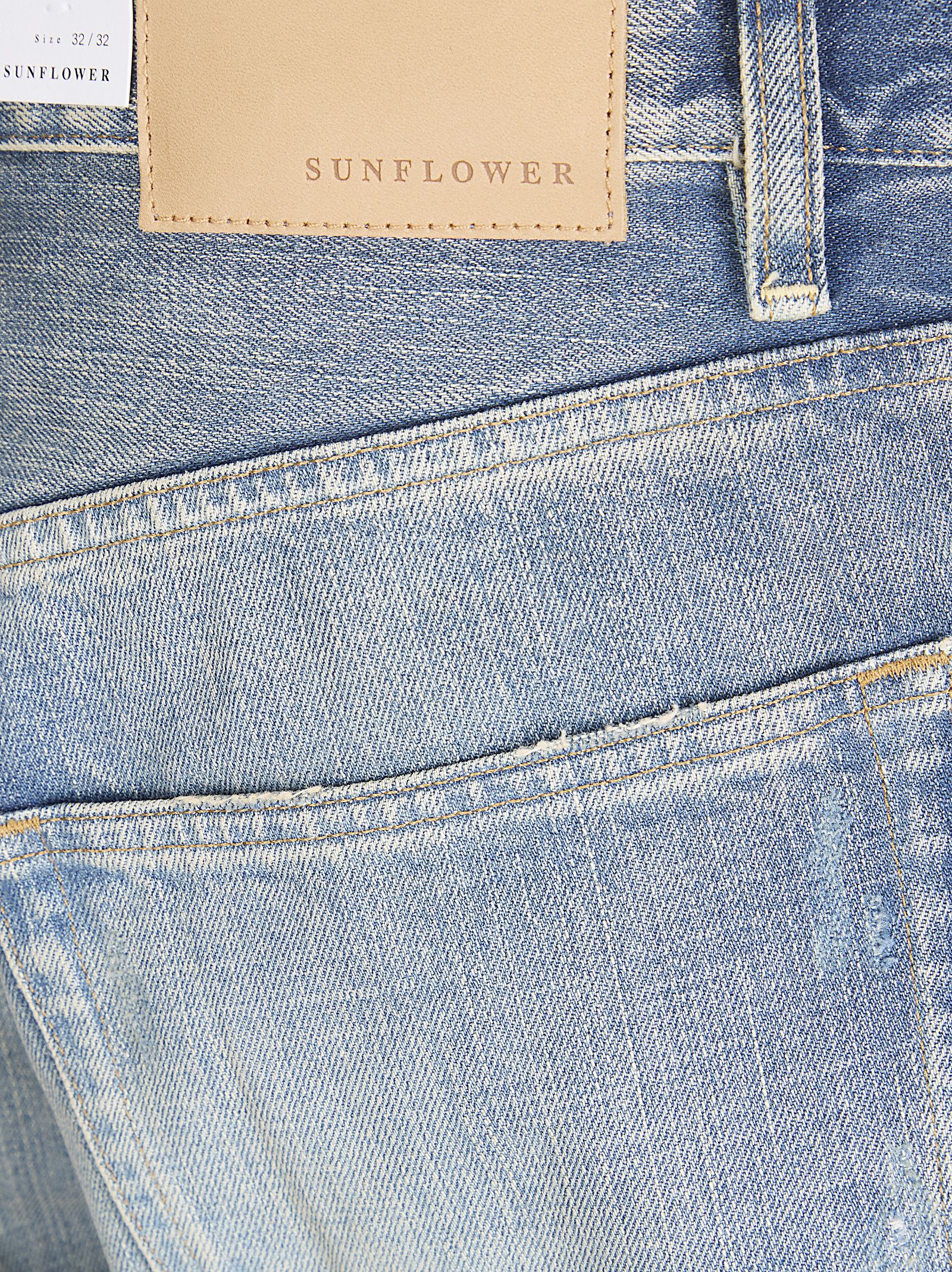 Vaqueros cinco bolsillos, cierre de botones, efecto destruido, pernera ancha.