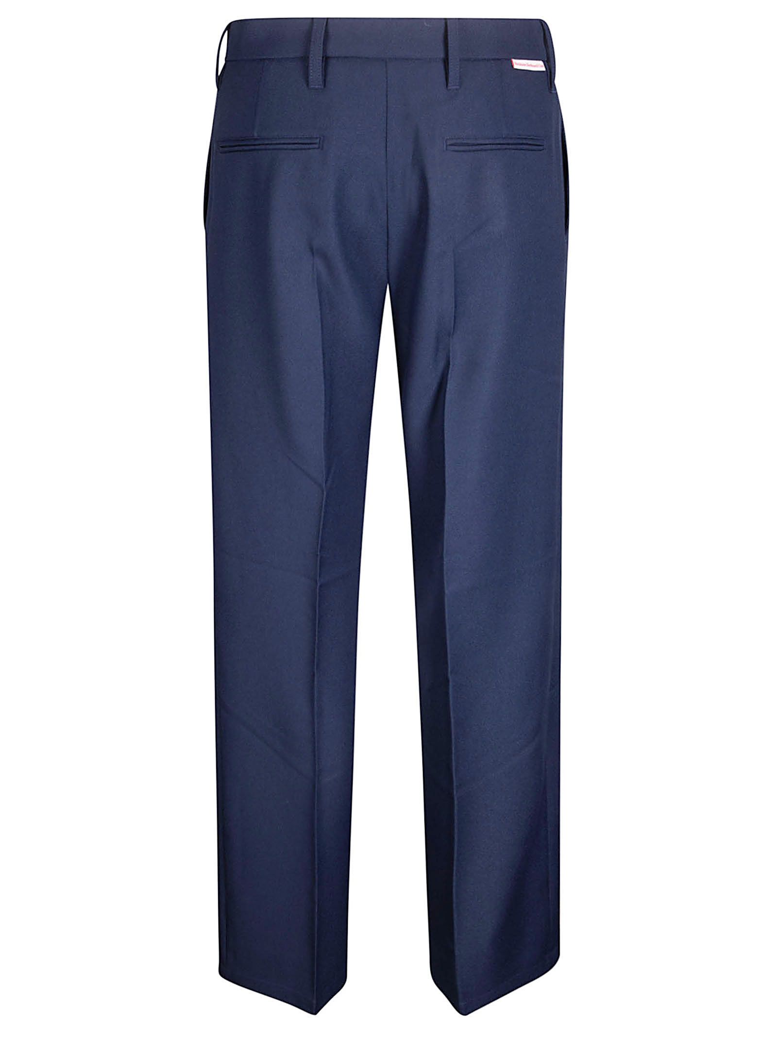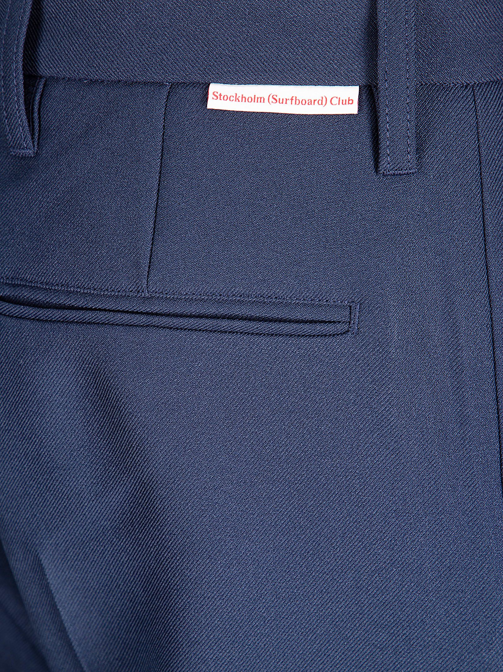 Pantalón sastre, tejido sintético, bandas delanteras, cierre con botones y cremallera, pierna recta.