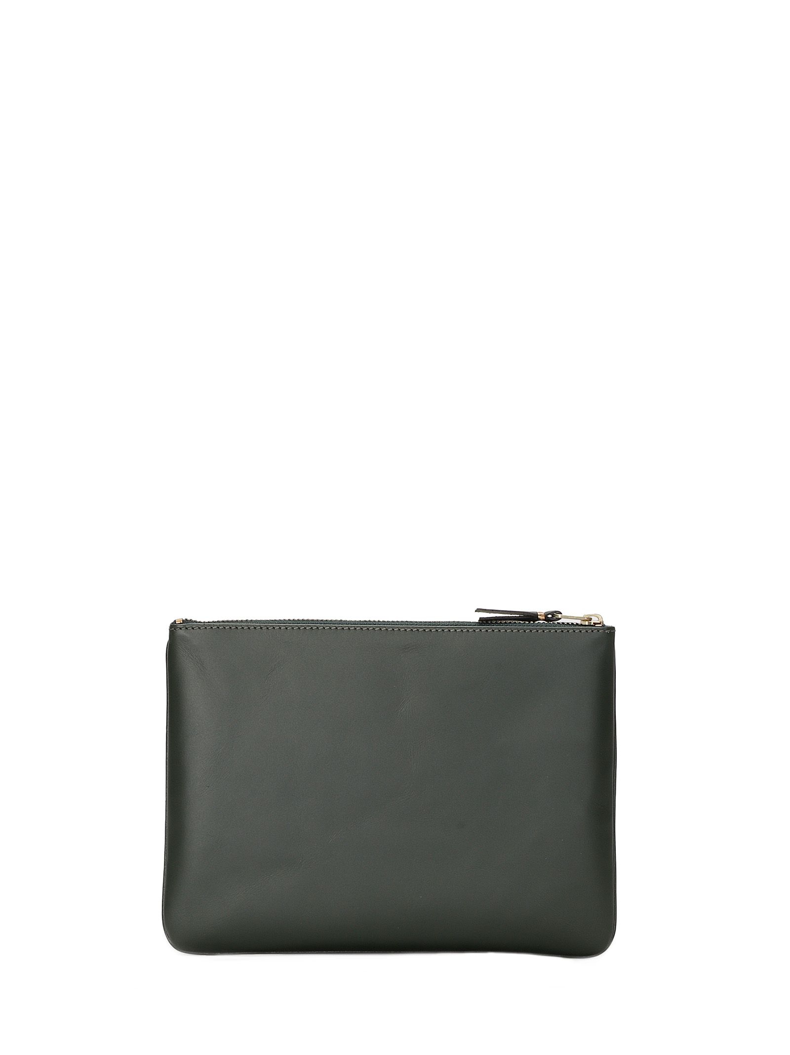 Cartera sencilla de color verde con cierre de sobre y logo frontal dorado, tamaño grande.