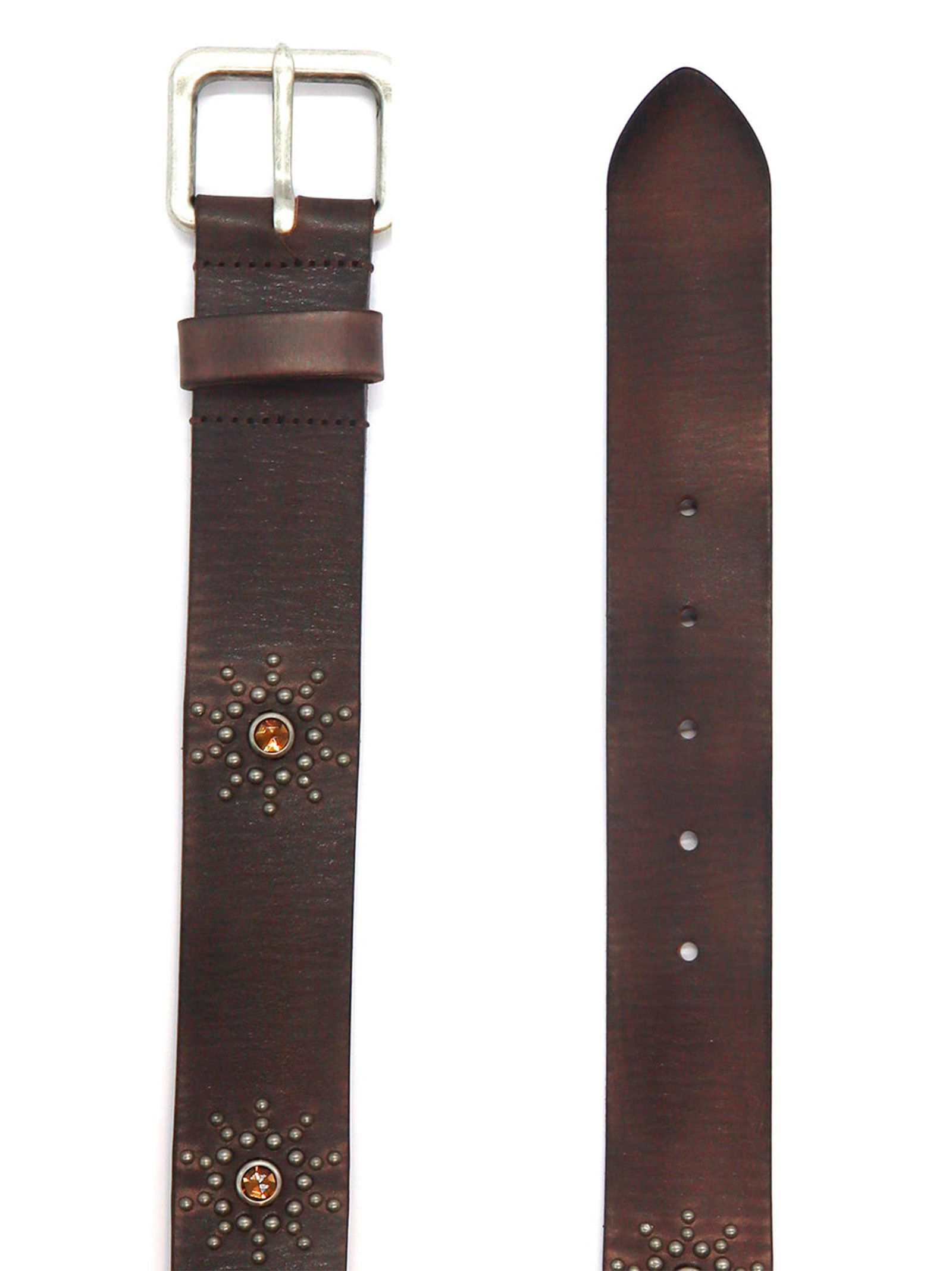 Cintura marrone realizzata in pelle bovina con borchie metalliche e dettaglio in cristallo arancio.