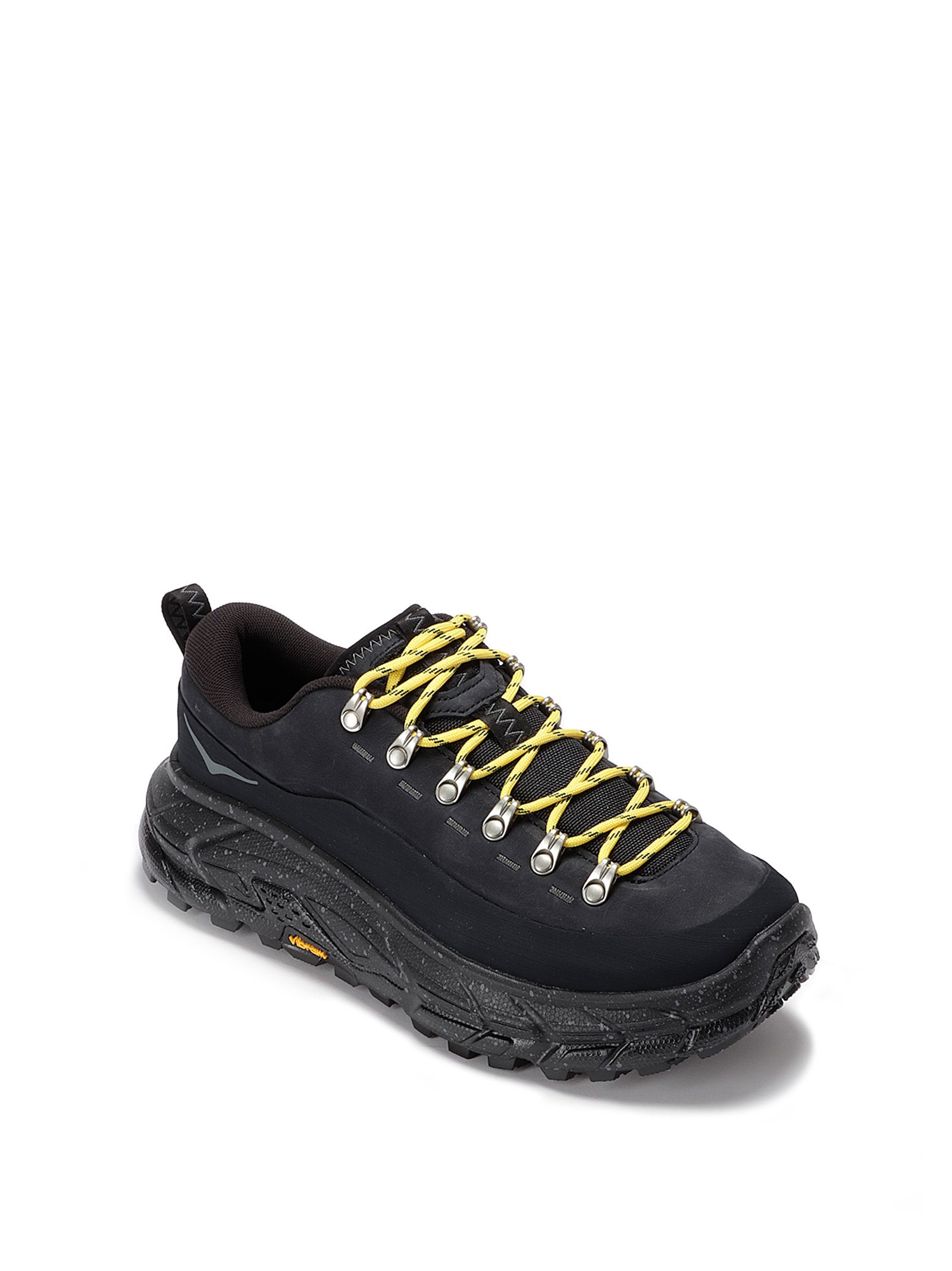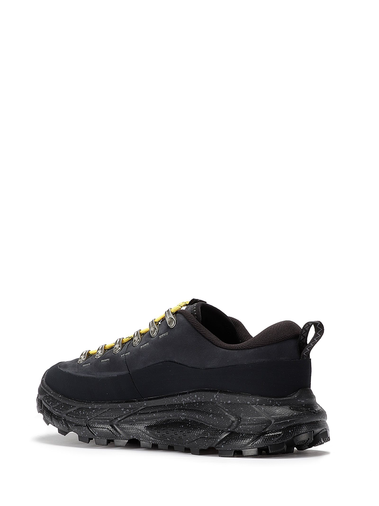 Deportivas Hoka One One negras modelo U Tor Summit, suela Vibram, cordones amarillos con ojales técnicos.