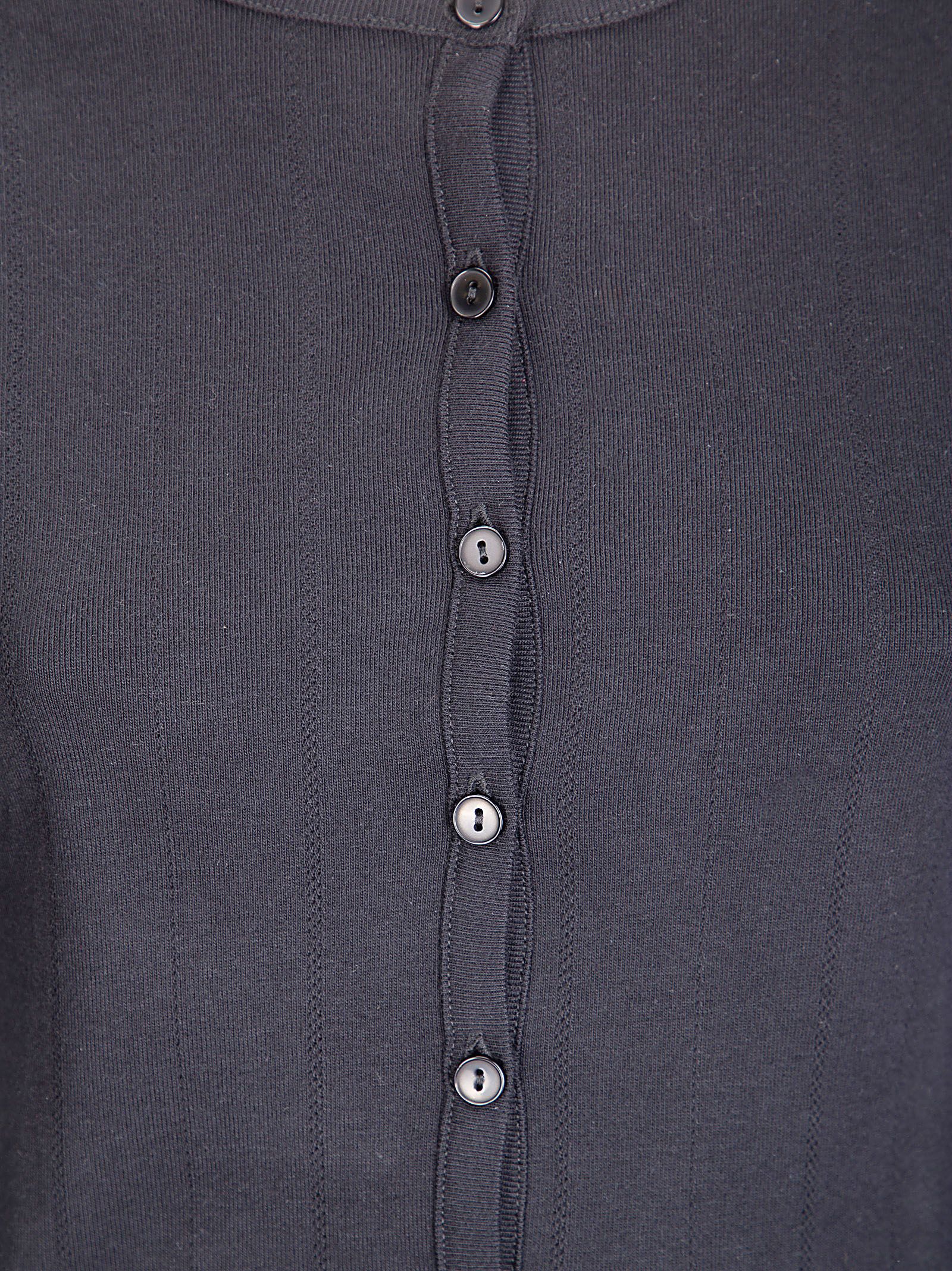 Cardigan con lavorazione a coste, chiusura con bottoni frontali, scollo tondo e orlo dritto.