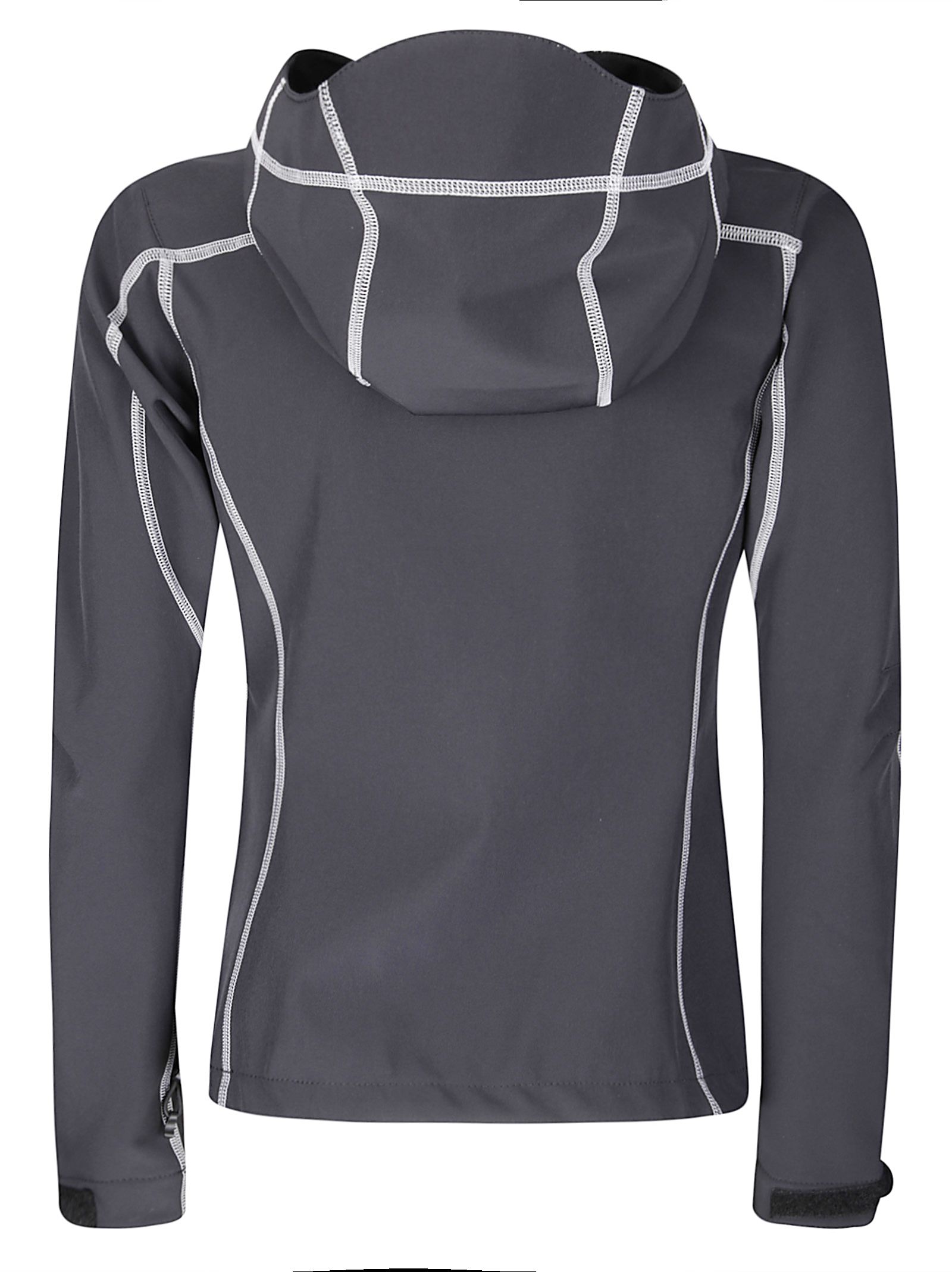 Chaqueta técnica adecuada para climas fríos, cierre de cremallera, capucha, bordado en contraste.