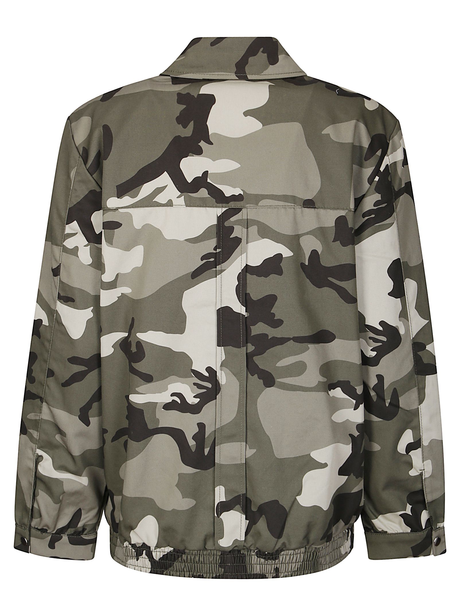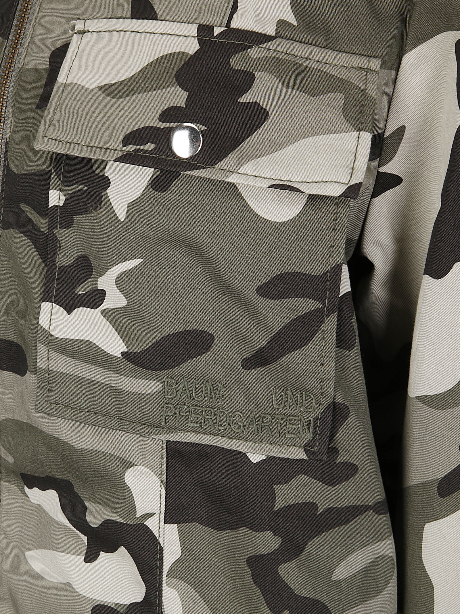 Chaqueta con estampado militar, bolsillos delanteros con botones en contraste, cierre de cremallera, bajo elástico.