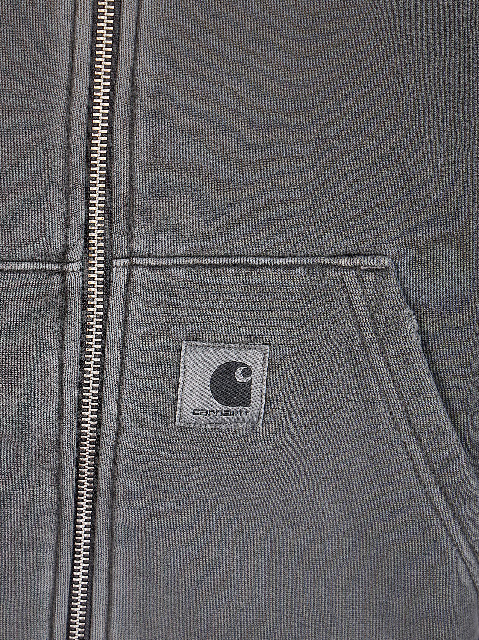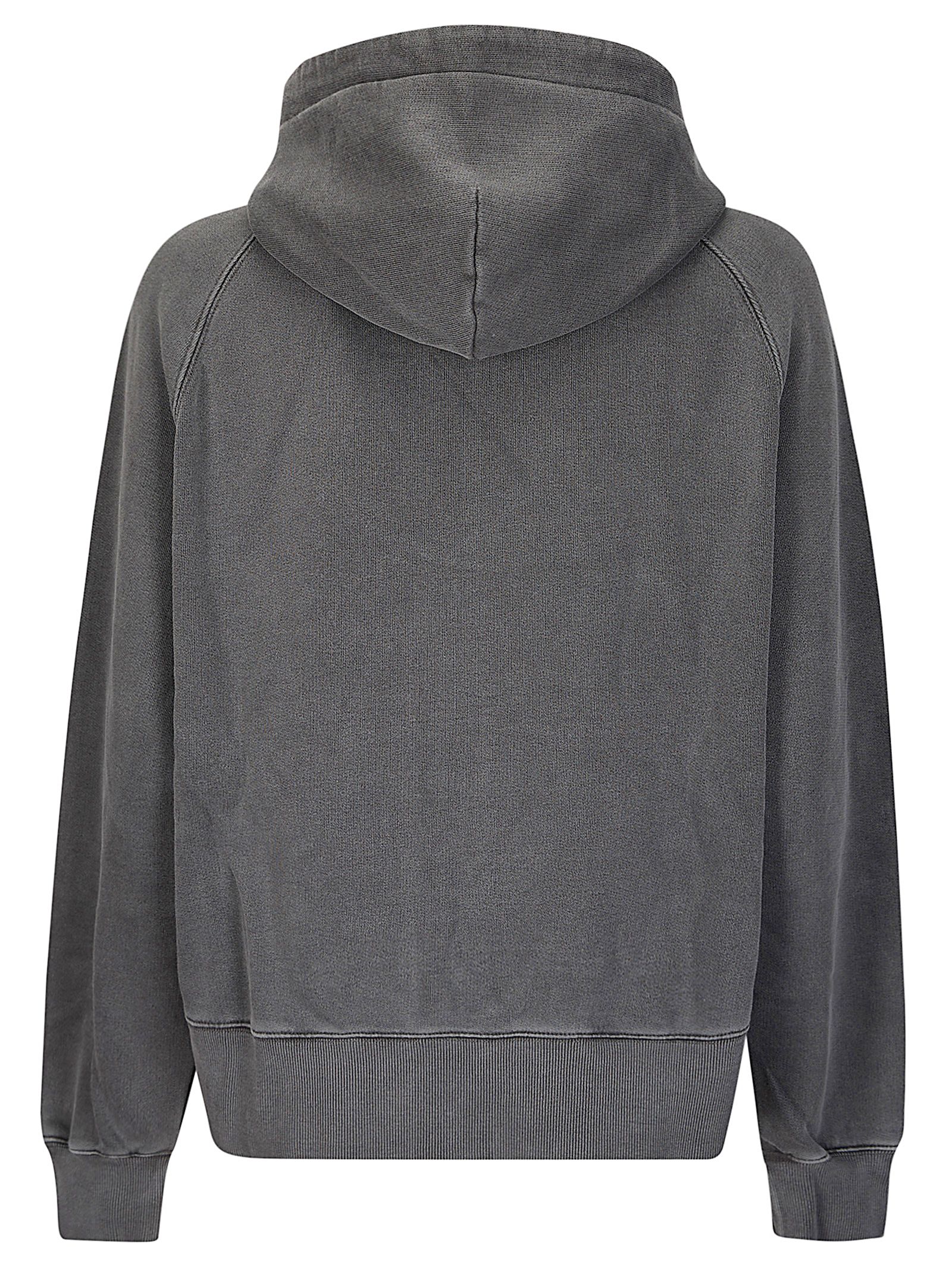 Felpa con cappuccio con coulisse in cotone pesante, maniche lunghe, tasca a marsupio, chiusura con zip doppio cursore, etichetta logo frontale.