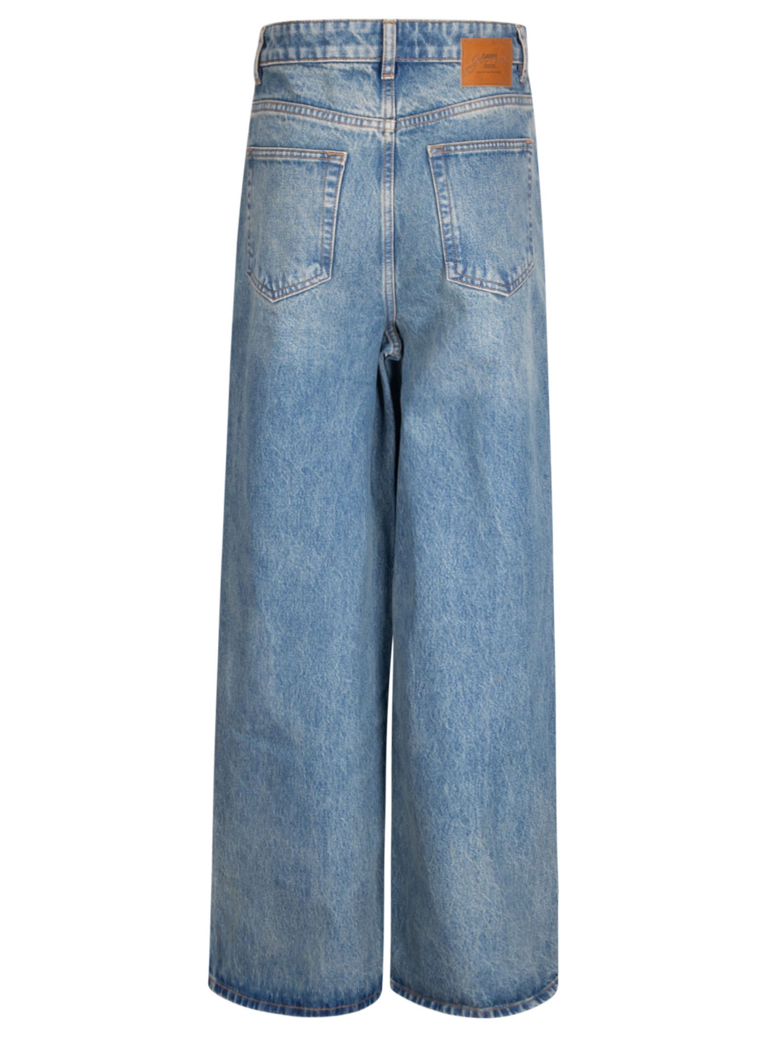 Vaqueros de tiro alto, cinco bolsillos, tiro bajo y pierna ancha confeccionados en denim no elástico.