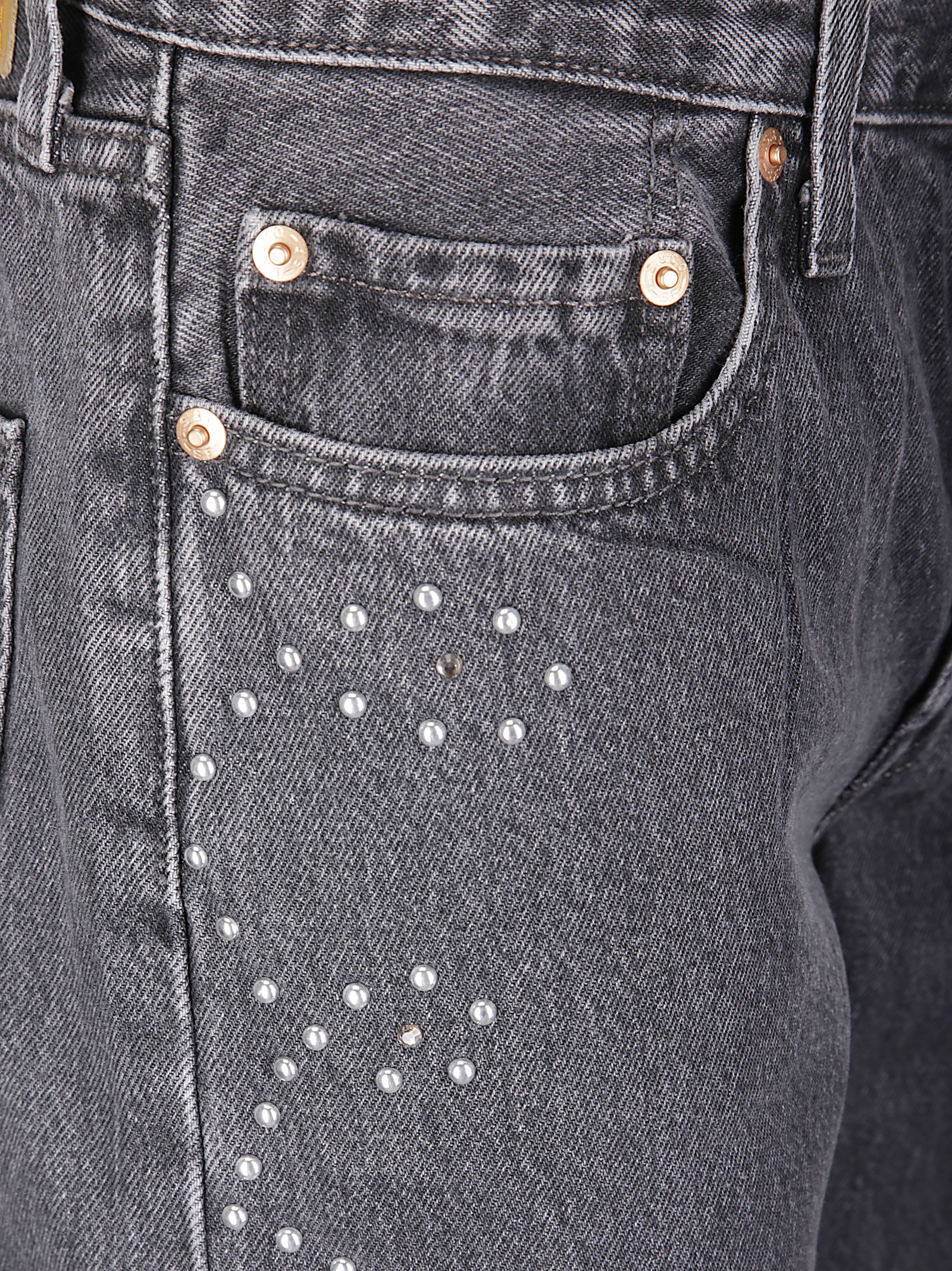 Vaqueros de cinco bolsillos, cierre de botones, pierna recta, cómodos en el muslo, corte regular, detalle de tachuelas en el largo de la pierna.