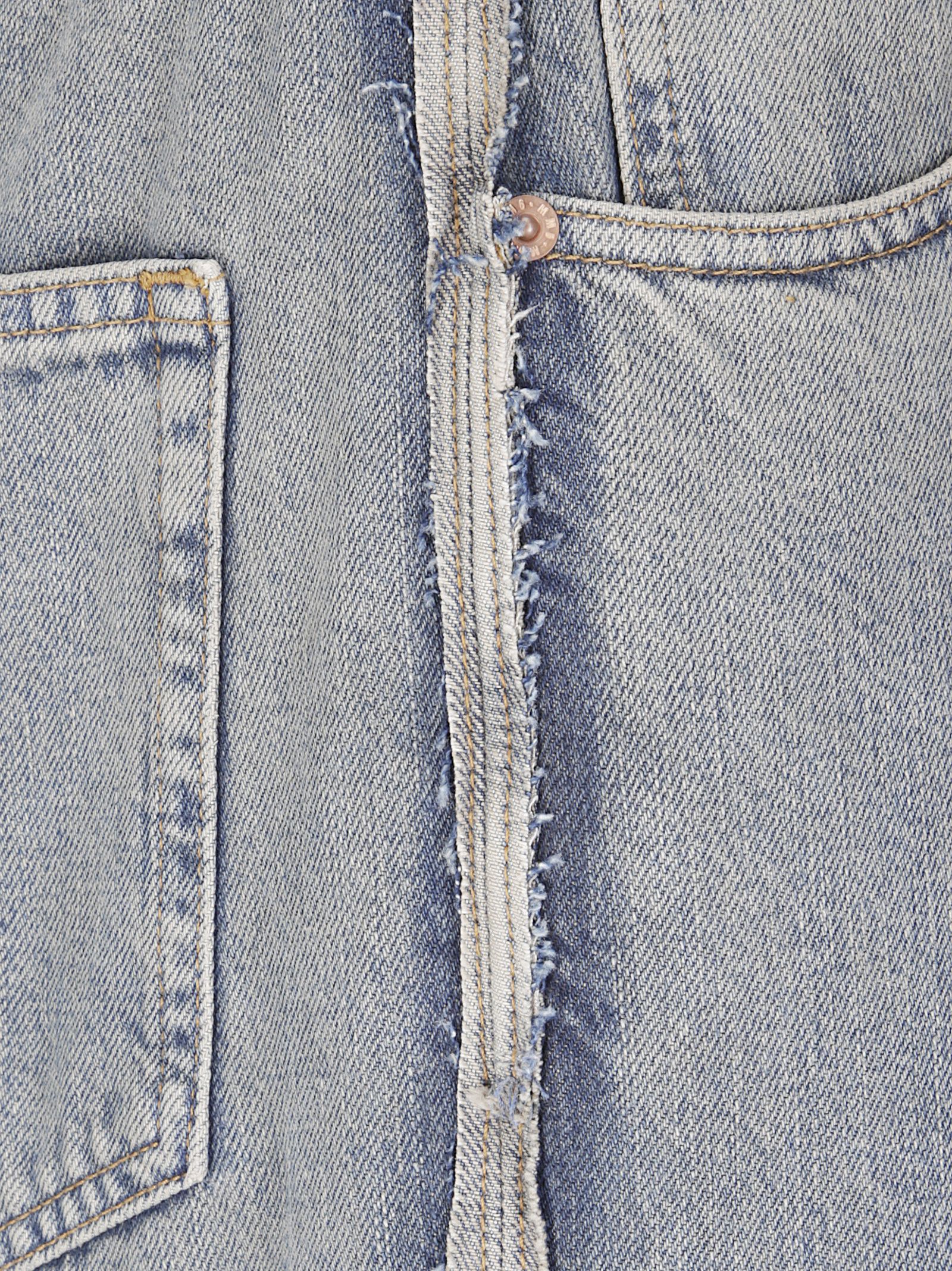 Pantalón cinco bolsillos, cintura alta, pierna ancha y recta, bordes deshilachados.