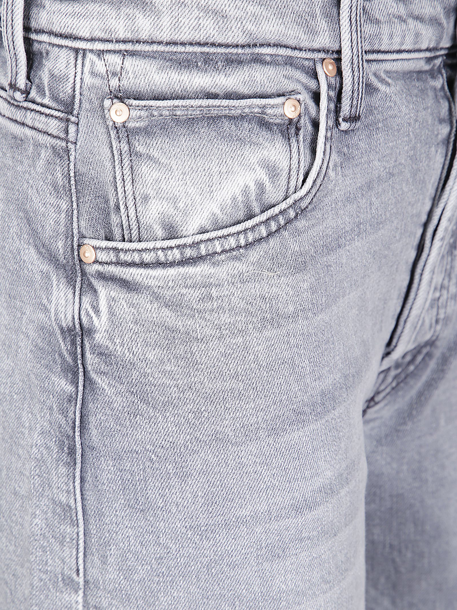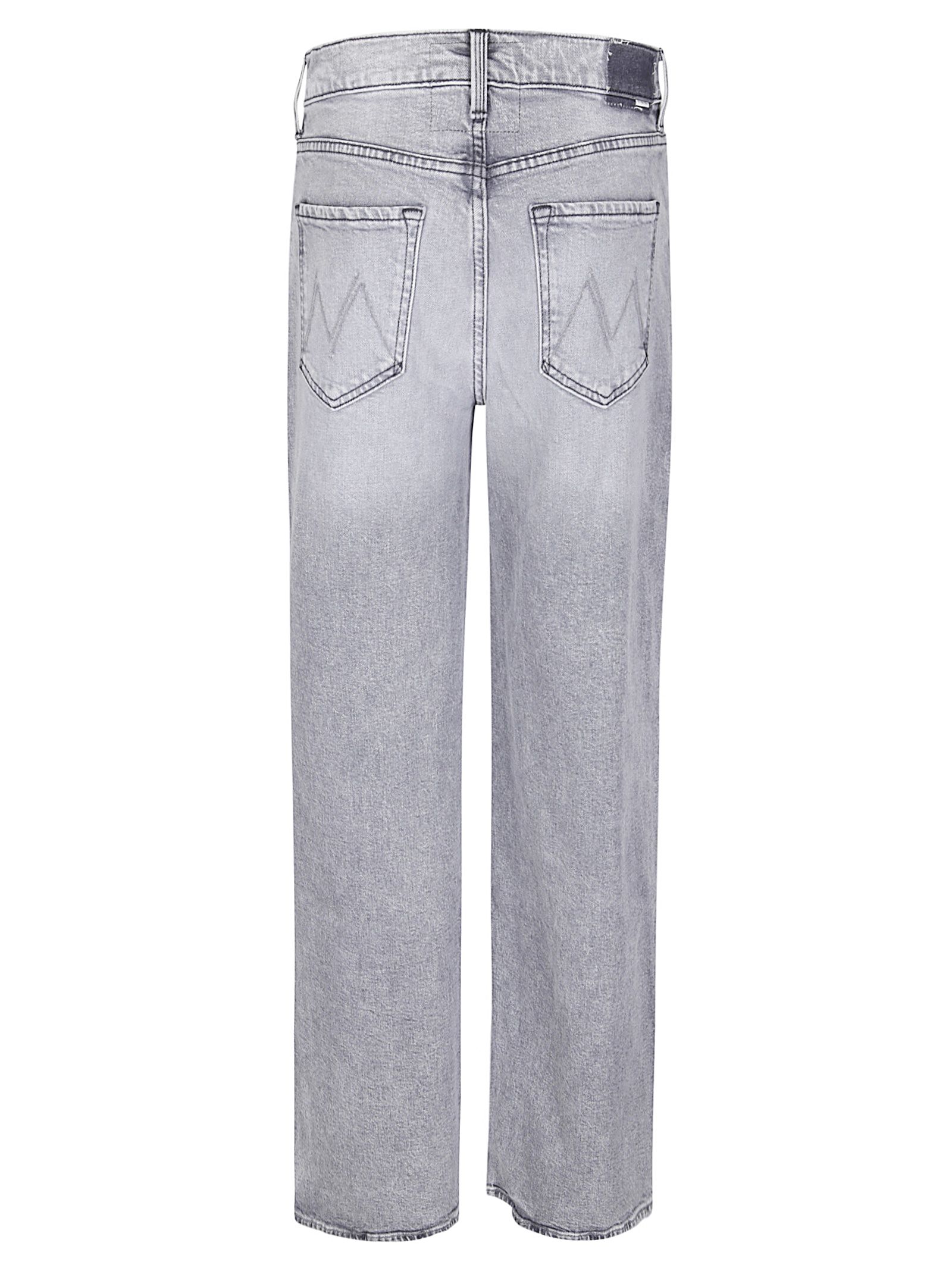 Jeans gris lavado medio, pierna ancha, cintura alta y etiqueta trasera desgastada.