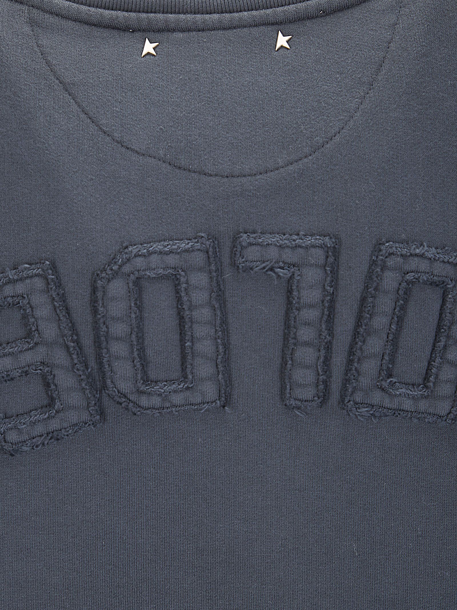 Felpa girocollo, maniche lunghe, effetto distressed, scritta in stoffa applicata posteriore, vestibilità morbida