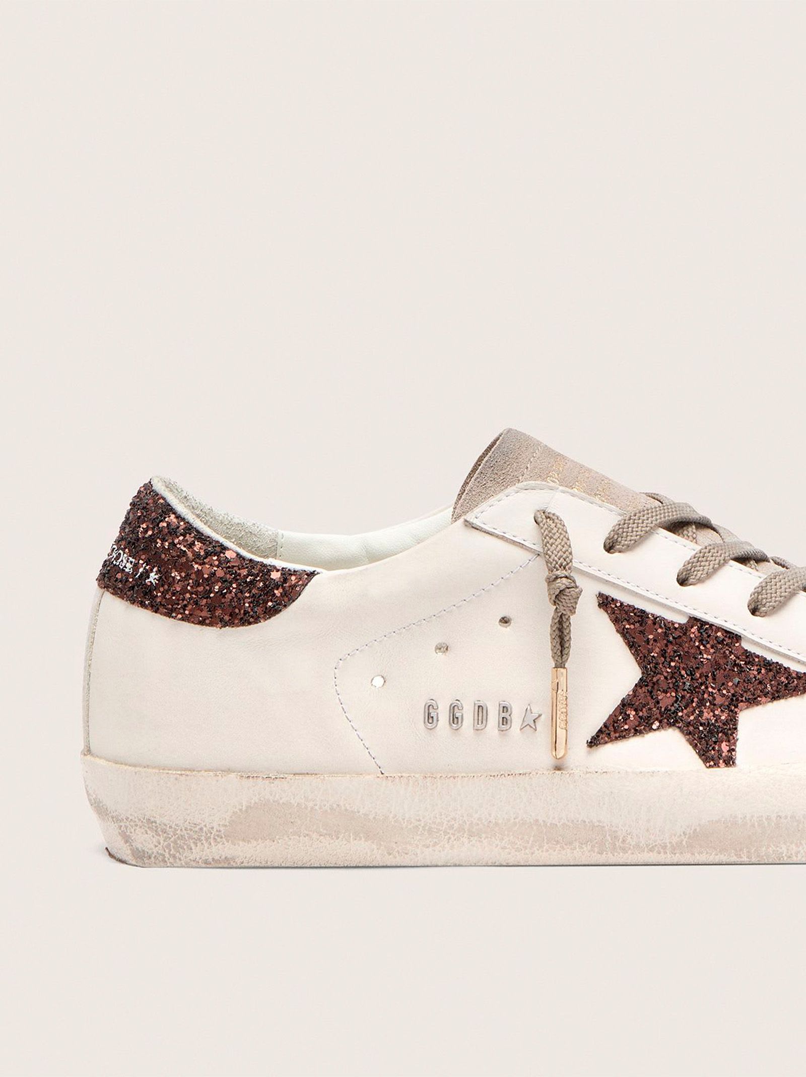 Zapatillas de piel Super Star, tacón y estrella con purpurina marrón, piel envejecida, cordones de algodón con extremos cubiertos, puntera de ante.