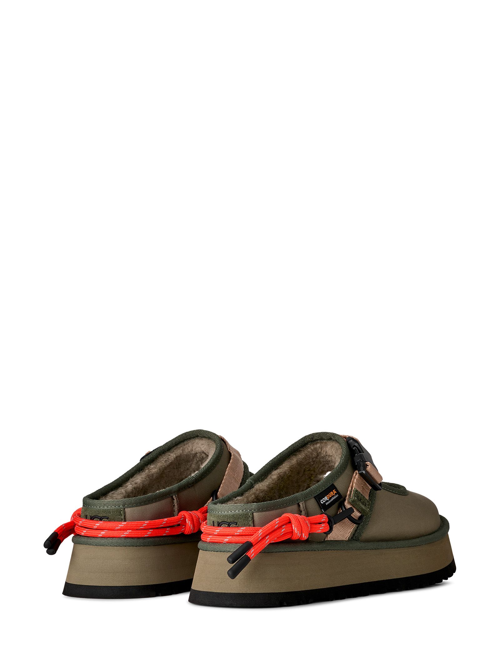 Ciabatte in pelle e cordura, interno in pelliccia, suola a contrasto media, dettagli con fibbia, filo arancione posteriore.