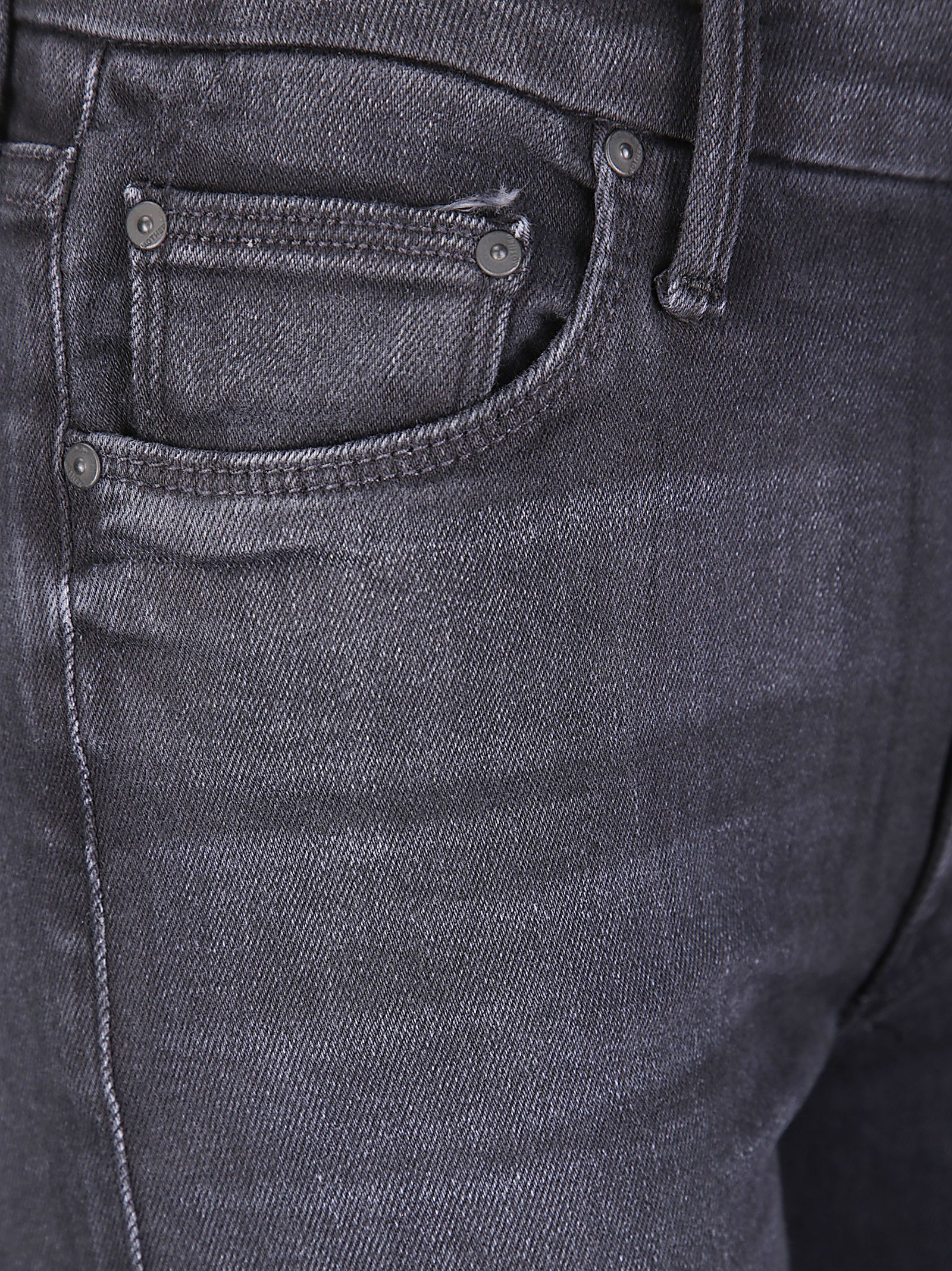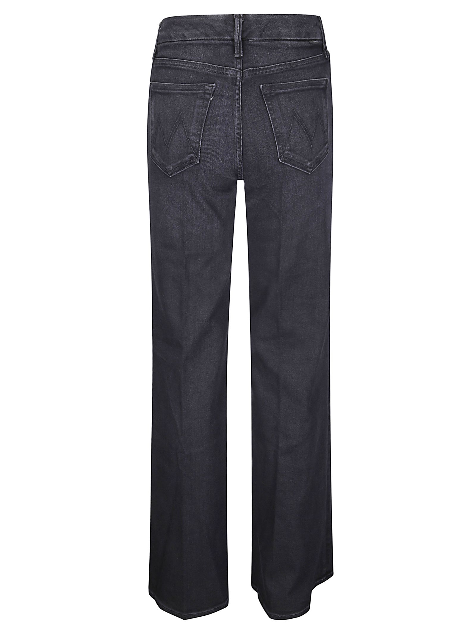 Jean noir délavé moyen-foncé, tissu semi-extensible, jambe large, taille haute.