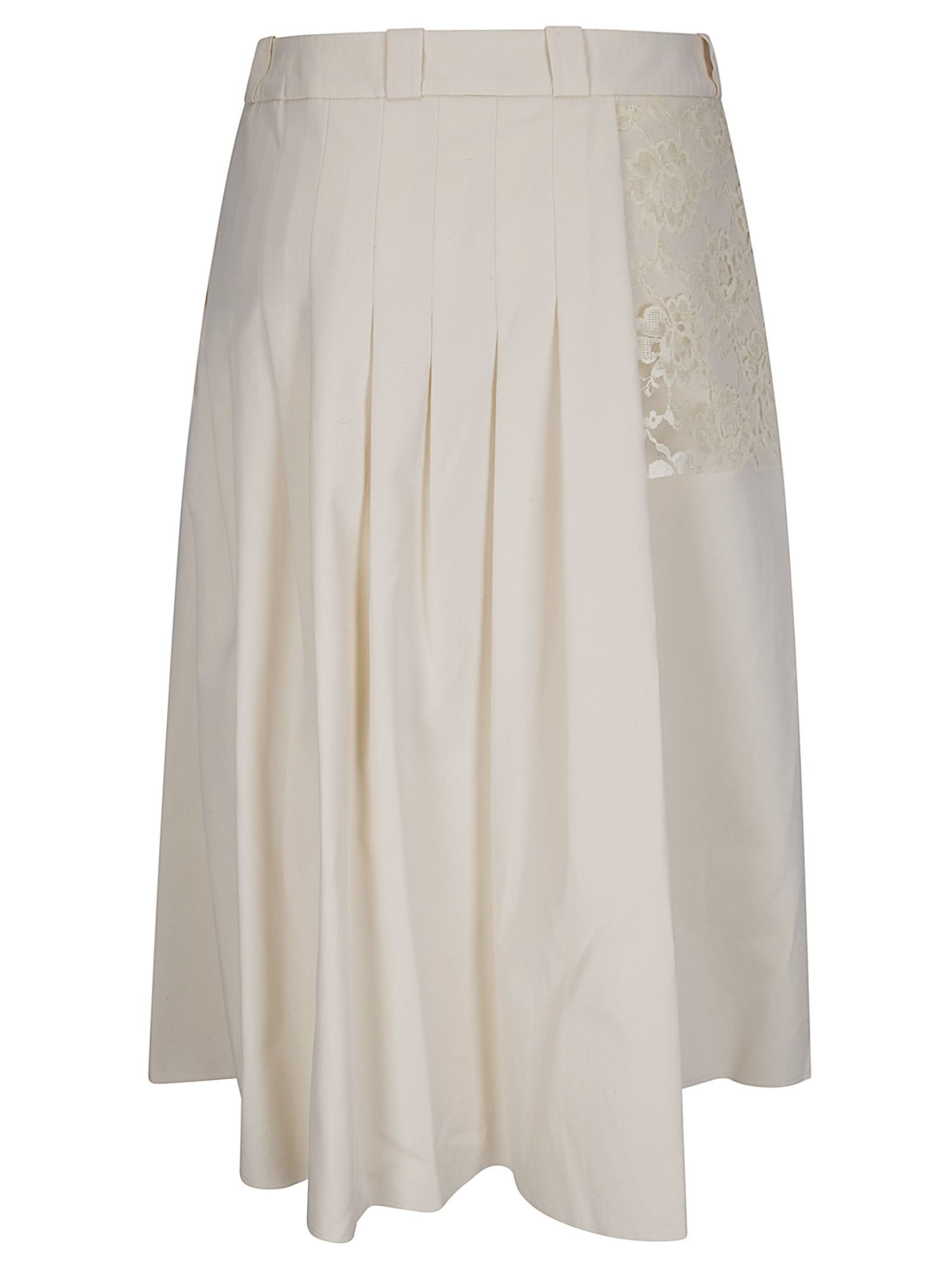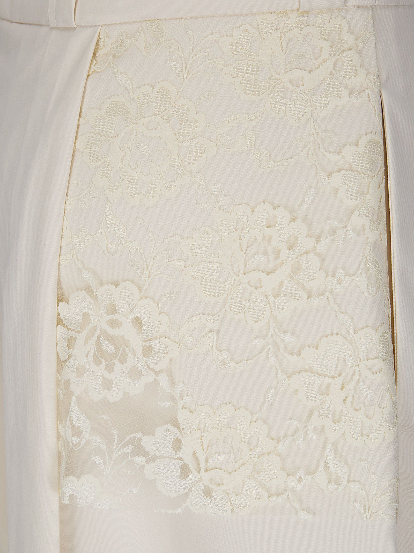 Gonna midi con impunture minimali con orlo a taglio vivo e passanti per cintura, pieghe definite sul lato sinistro e sul pannello posteriore, chiusura con zip e bottone in vita, pannello in pizzo con motivo floreale